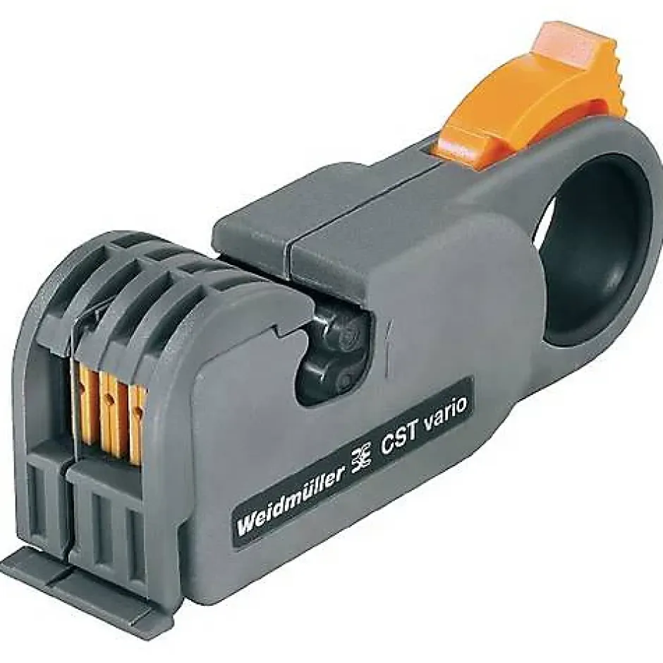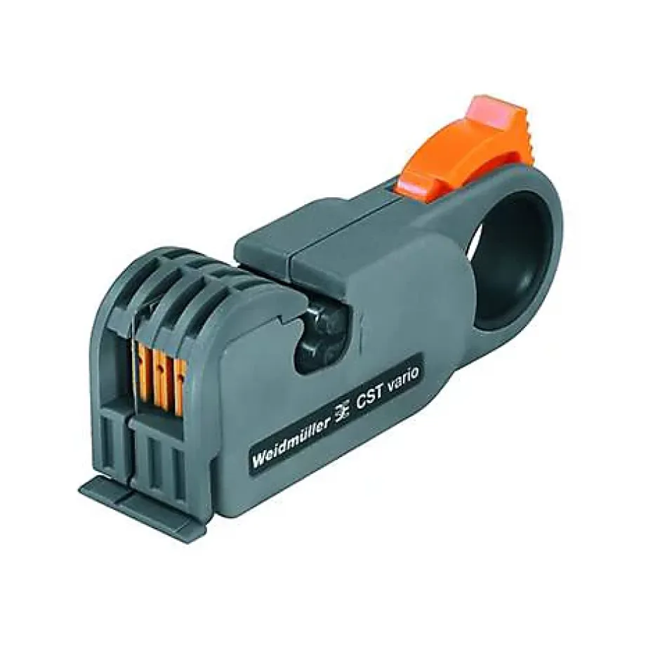 Outil de dénudage CST VARIO Weidmüller, compact et léger, pour câbles coaxiaux et informatiques ronds blindés de 2,5 à 8 mm. Permet un dénudage précis sur un, deux ou trois niveaux en une seule opération, idéal pour les travaux réseau et TV, livré à l’unité.