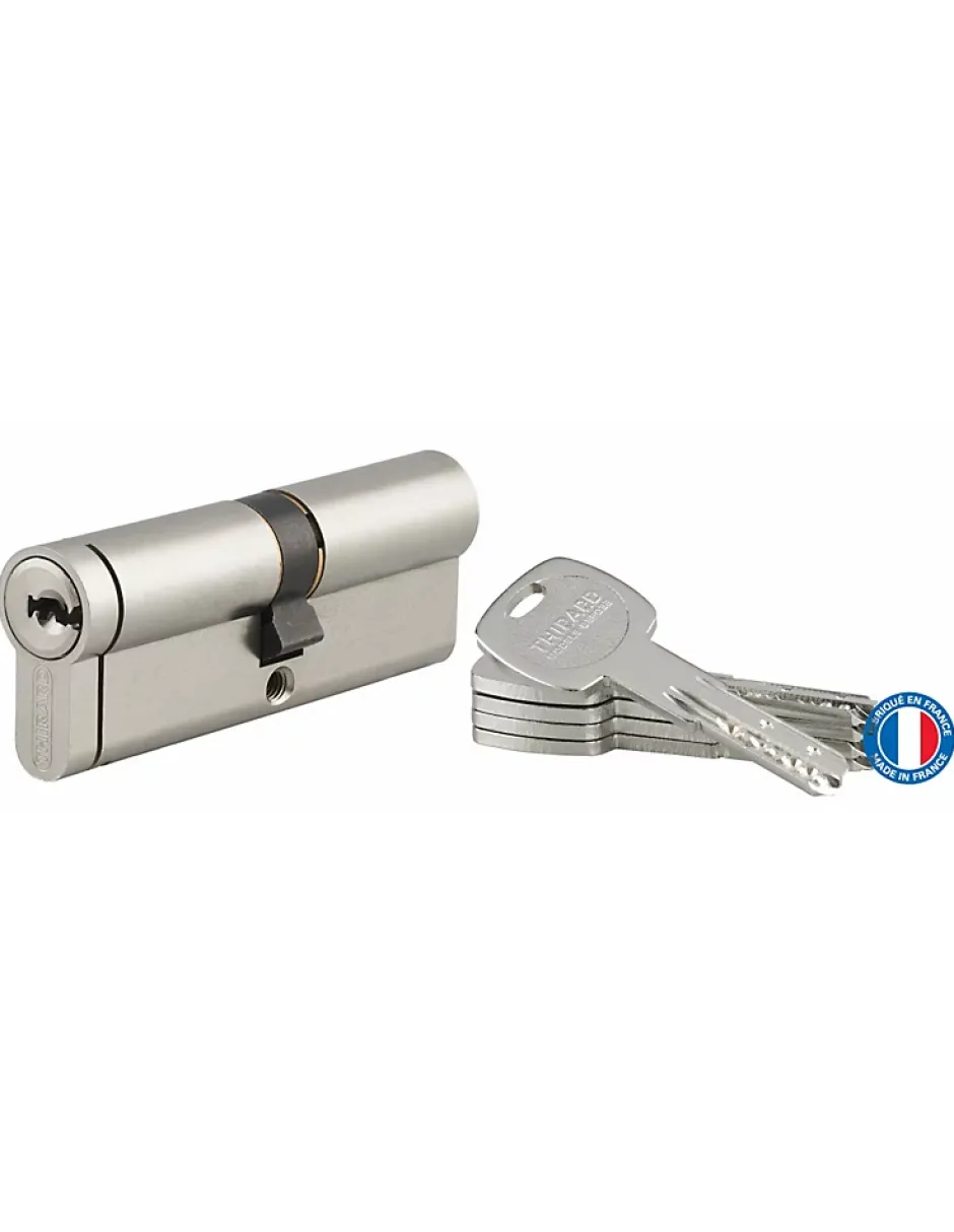 Cylindre T2 à clé réversible – Sécurité et fiabilité maximalesLe cylindre T2 de Thirard est une solution idéale pour garantir la sécurité de vos accès. Conçu avec un système à clé réversible, il offre un confort d’utilisation optimal, permettant de verrouiller et déverrouiller facilement sans se soucier de l’orientation de la clé. Ce cylindre est livré avec 5 clés longues, chacune équipée d’une tête de clé colorée pour faciliter l’identification et éviter toute confusion, un atout majeur pour une gestion simplifiée des accès.Le cylindre T2 s’adapte à de nombreux types de portes, offrant une installation simple et rapide. Sa finition nickelé garantit à la fois une excellente résistance à l’usure et une esthétique moderne et discrète.Le cylindre T2 est conçu pour répondre aux exigences de sécurité des professionnels comme des particuliers, offrant une protection efficace contre les tentatives d’effraction. Que ce soit pour des portes d’entrée, des portails ou des locaux nécessitant un niveau de sécurité renforcé, le cylindre T2 est une solution fiable, durable et pratique.