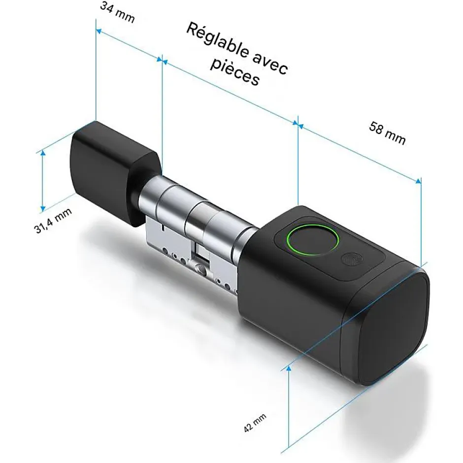 Cylindre Électronique de Serrure Connectée à empreinte, badge RFID et codesVous cherchez à sécuriser et moderniser votre porte ? Notre cylindre électronique de serrure connectée est la solution parfaite pour remplacer un cylindre classique et profiter d’une serrure intelligente sans clé. Facile à installer en quelques minutes, il transforme votre entrée en une porte moderne, sécurisée et pilotable à distance.Tout en gardant la possibilité d’une ouverture de secours par clè classique.Une serrure connectée 4-en-1 pour un confort totalCe cylindre intelligent offre plusieurs modes d’ouverture pour s’adapter à tous vos besoins :* Code PIN personnalisé – Entrez un code unique pour ouvrir votre porte.* Badge RFID – Idéal pour les membres de la famille, les collaborateurs ou les enfants.* Empreinte digitale – Déverrouillez avec votre doigt pour une sécurité optimale.* Application mobile Tuya – Commandez votre serrure connectée depuis votre smartphone, même à distance.Grâce à ces solutions, vous bénéficiez d’une serrure sans clé pratique et sécurisée, adaptée aussi bien aux maisons, appartements, bureaux et locations saisonnières.Gestion des accès via l’application Tuya SmartAvec l’application Tuya Smart, la gestion de votre serrure connectée devient simple et rapide :* Créez et supprimez des codes d’accès en quelques secondes.* Gérez vos badges RFID et vos empreintes digitales facilement.* Envoyez des codes temporaires à vos invités, locataire saisonnier ou prestataires de service.* Consultez l’historique d’ouverture pour un contrôle total de vos accès.Installation rapide et sans outils complexesRemplacez votre cylindre classique en moins de 5 minutes. Ce cylindre électronique ne nécessite aucun perçage ni câblage et s’adapte à la plupart des portes standards ( voir tableau ci-dessous). Même sans expérience en bricolage, vous pouvez installer votre serrure connectée en toute autonomie.