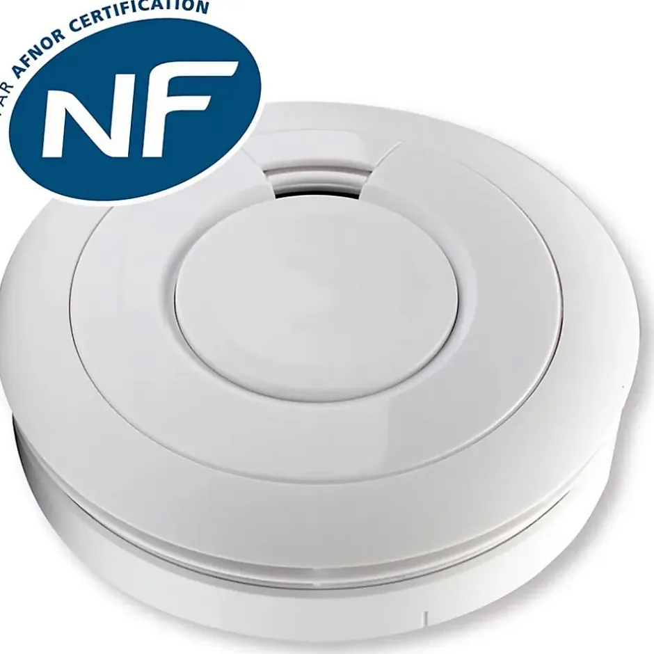 Détecteur de fumée optique haute sensibilité Alimentation par pile lithium scellée 3V, autonomie 10 ans Technologie ACP auto-compensation à la poussière pour limiter les fausses alarmes Bouton Test & Silence large et pratique avec alarme progressive Puissance sonore 85 dB(A) à 3 m, LED rouge indicatrice Socle Multi-fit avec système antivol, vis et chevilles inclus Dimensions : Ø115 x 50 mm, poids 185 g – Certifié CE EN14604 et NF DAAF – Garantie 5 ans
