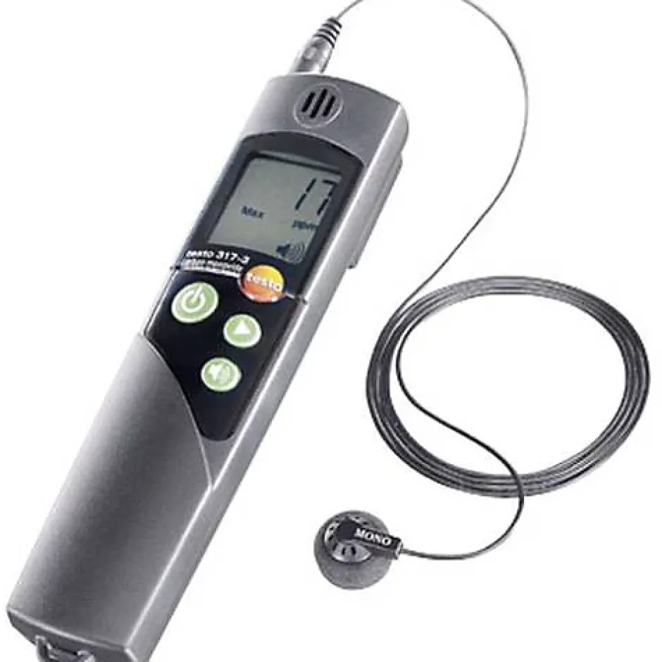 Détecteur de monoxyde de carbone testo 317-3, plage 0-1999 ppm, seuil d’alarme réglable, remise à zéro sur site, alarmes visuelle et acoustique, prêt à l’emploi, temps de réaction 40 s, résolution 1 ppm.