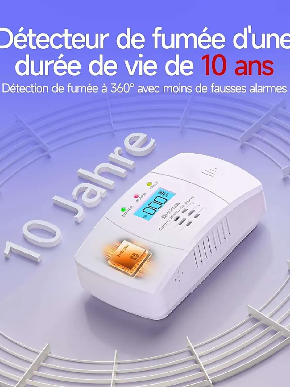 Le detecteur de monoxyde de carbone HEIMAN est concu pour assurer la securite quotidienne de vos espaces interieurs. Dote dune alarme puissante de 85 dB. il signale tout risque dintoxication au monoxyde de carbone. notamment en cas de combustion incomplete de vos appareils comme les cheminees ou chaudieres a gaz. Son format rectangulaire compact avec des dimensions precises (L.12.5 cm l.7.5 cm H.2.8 cm) permet une installation discrete aussi bien au mur que sur une surface plane. Trois voyants LED distincts assurent un controle continu de letat de fonctionnement le vert indique la puissance. le jaune une erreur et le rouge lalarme. Ce detecteur integre egalement un bouton de test qui rend tres simple la verification reguliere de la fonctionnalite de lappareil. Certifie selon la norme EN 50291. il comporte un capteur haute performance offrant une duree de vie allant jusqua 10 ans. pour une tranquillite desprit durable. Alimente par deux piles AA incluses. il ne requiert aucun branchement electrique. assurant flexibilite et facilite dinstallation sans outillage complexe. Lecran daffichage offre une lecture claire des alertes et de letat du detecteur. Il fonctionne meme dans une large gamme de temperatures (-10 a 40 degC) et une humidite de 20% a 95%. convenant a la grande majorite des habitations et locaux techniques. Fabrique en ABS robuste et resistant. ce detecteur allie securite et durabilite. Chaque livraison comprend le detecteur. deux vis. deux chevilles. un support de montage. deux piles AA et un manuel dutilisation. Facile dutilisation grace a lauto-test LED. il previent en cas derreur et signale lorsque la batterie est faible. vous assurant detre averti a tout moment.