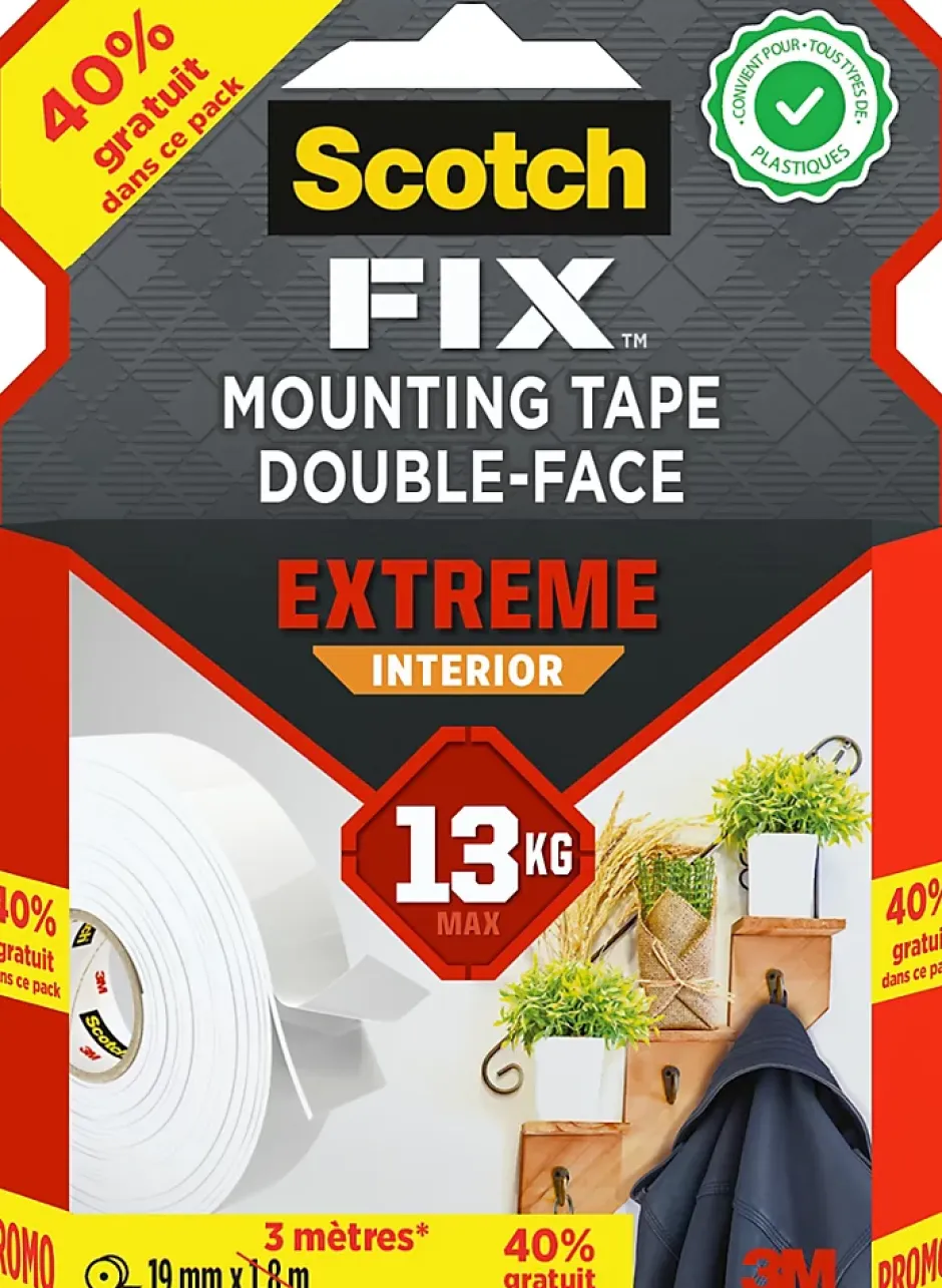 - Le ruban adhésif permanent double face extrême intérieur 3M Scotch FIX™ est un ruban double face extra fort conçu pour fixer des objets sur un ensemble de surfaces variées telles que les murs peints, le verre, le bois, le métal, et les plastiques