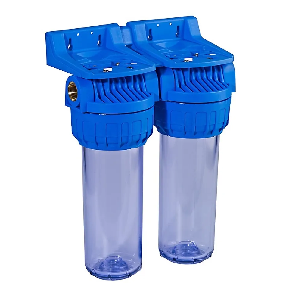 Double porte filtre 9″ 3/4 pour les cartouches de filtrationUtilisation sur les eaux de forage ou de surfaceEn eau de ville sur le réseau général de l’habitationCaractéristiques :Qualité alimentaire ACS N°09 ACC LY 346Température de service : 45°cPression maxi : 7 barHauteur : 358 mmLargeur : 3268 mmPoids : 2,12 kgRaccordement sur canalisation cuivre, plastique ou multicouche