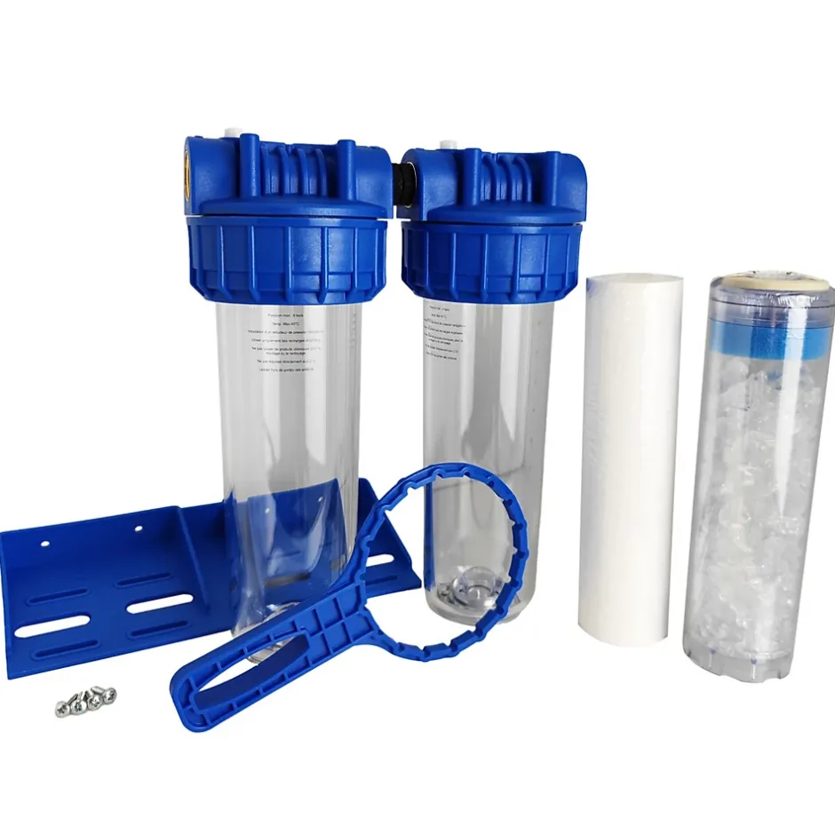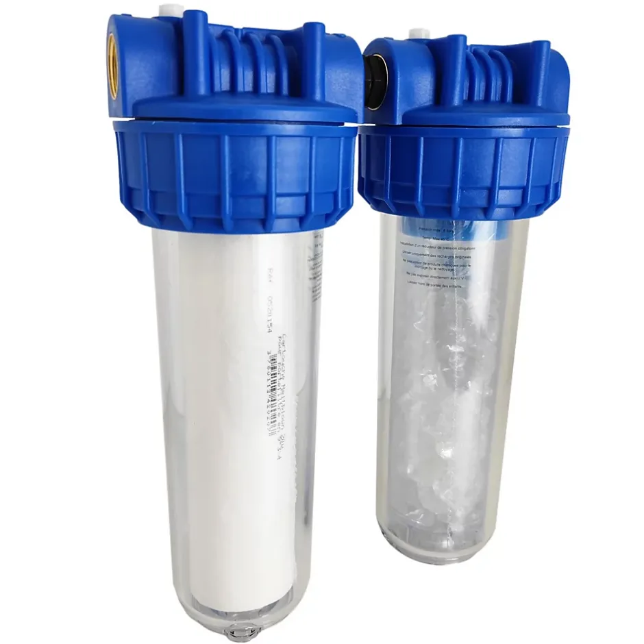 Double Porte-filtre pour cartouches filtrantes 9″3/4.L’ensemble est composé de 6 pièces avec deux bagues de serrage tournantes qui assurent une étanchéité optimale entre les bols transparents et les têtes.Ce porte filtre double 9″3/4 est idéal pour traiter les impuretés, sédiments et calcaire présents dans l’eau. (Toutes les cartouches compatibles sont disponibles sur notre boutique.)Ce filtre double est particulièrement utile pour faire de la filtration sur un système de chauffage ou plus généralement sur de l’eau potable destinée à la boisson, avant un osmoseur ou filtre sous évier avec membrane d’Ultra-filtration.Compatible avec les cartouches de filtre à sédiment 9 pouces 3/4 allant de 1µm à 100µm.Contenu du kit de double porte-filtre 9″3/4 AF5010 insert laiton 20/27Le porte filtre double complet (bols + têtes)1 cartouche sédiments 20µm.1 cartouche de polyphosphate.1 Clé de montage / démontage.1 équerre de fixation.4 vis2 mamelons laiton Mâle – Mâle 20/27 (3/4″).