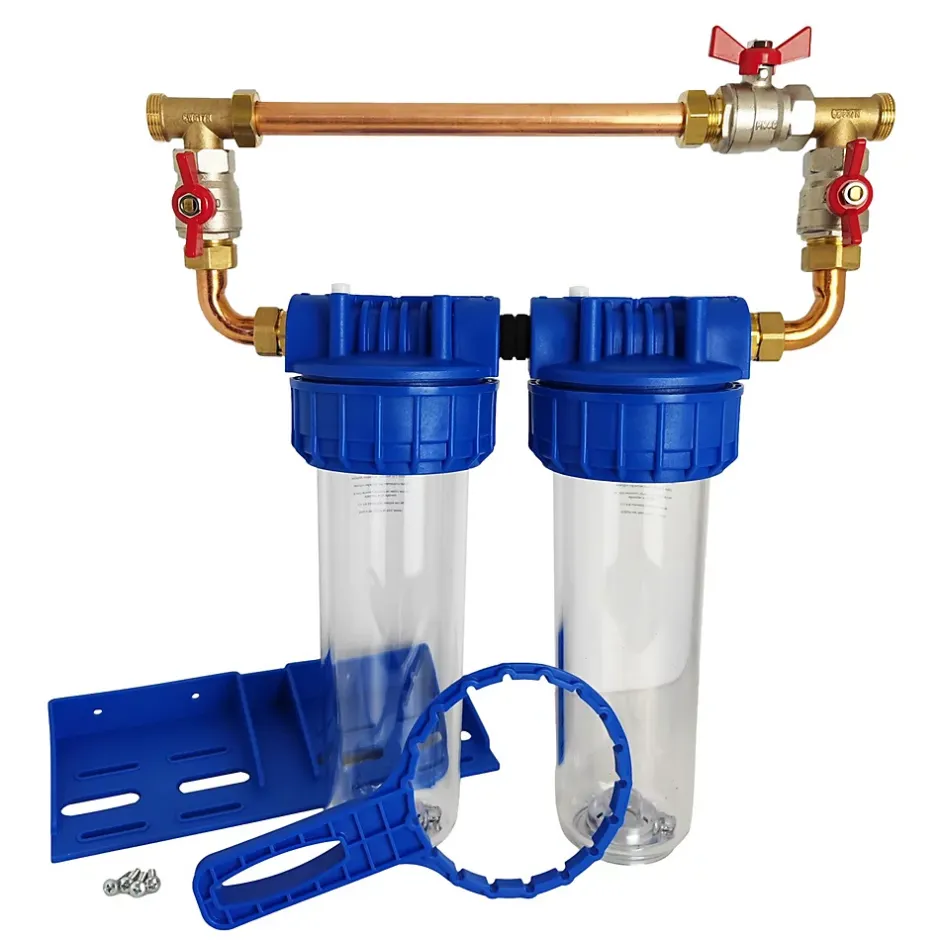 Double Porte-filtre avec bypass laiton pour cartouches filtrantes 9″3/4. L’ensemble est composé de 10 pièces avec deux bagues de serrage tournantes qui assurent une étanchéité optimale entre les bols transparents et les têtes, le bypass et trois vannes d’arrêt. Ce porte filtre double 9″3/4 avec bypass laiton est idéal pour traiter les impuretés, sédiments, chlore, mauvais goût ou odeurs désagréables et même le calcaire présents dans l’eau. (Toutes les cartouches compatibles sont disponibles sur notre boutique.) Ce filtre double est particulièrement utile pour faire de la filtration sur l’ensemble de votre réseau de tuyau d’eau de radiateurs ou en amont de votre adoucisseur d’eau ou avec un filtre sous évier pour rendre l’eau encore plus claire. Compatible avec les cartouches de filtre à sédiment 9 pouces 3/4 allant de 1µm à 100µm.Contenu du kit de double porte-filtre 9″3/4 AF5000BP bypass laiton 20/27Le porte filtre double complet (bols + têtes)1 bypass monté.1 Clé de montage / démontage.1 équerre de fixation.4 vis