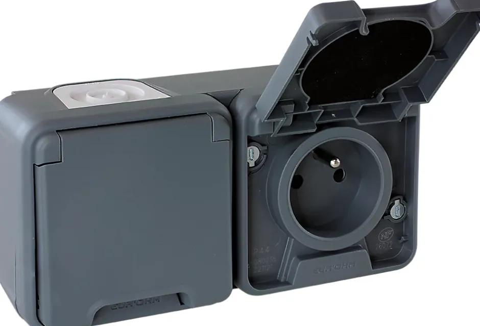 • Produit complet pour installation en saillie – Double prise 16A 2P+T Française• Certifiée NF selon norme NF C 61 314• Installation en horizontal• Etanchéité élevée IP55• Tenue aux chocs IK07 selon NF EN 62 262• Bornes à connexions automatiques, avec boutons de déconnexion• Trés grand espace de cablage• Semelle avec élastomère pour s’adapter aux murs irréguliers• Gain de temps grace à une installation optimisée• Couleur Gris RAL 7012