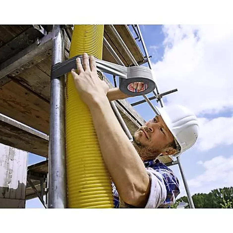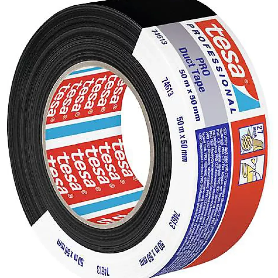 tesa Duct Tape PRO 74613-00002-00, ruban de réparation noir 50 m x 50 mm. Ruban adhésif mono-face à base de caoutchouc synthétique avec support tissu PET, conçu pour des applications intérieures et extérieures. Offre une adhérence puissante sur surfaces lisses et rugueuses, excellente étanchéité et grande flexibilité pour s’adapter aux formes. Idéal pour la réparation, le marquage, la fixation, l’étanchéité et le conditionnement. Facile à déchirer et à poser, se retire entièrement sans laisser de résidus. Disponible en noir (également en gris), garantie fabricant 2 ans.