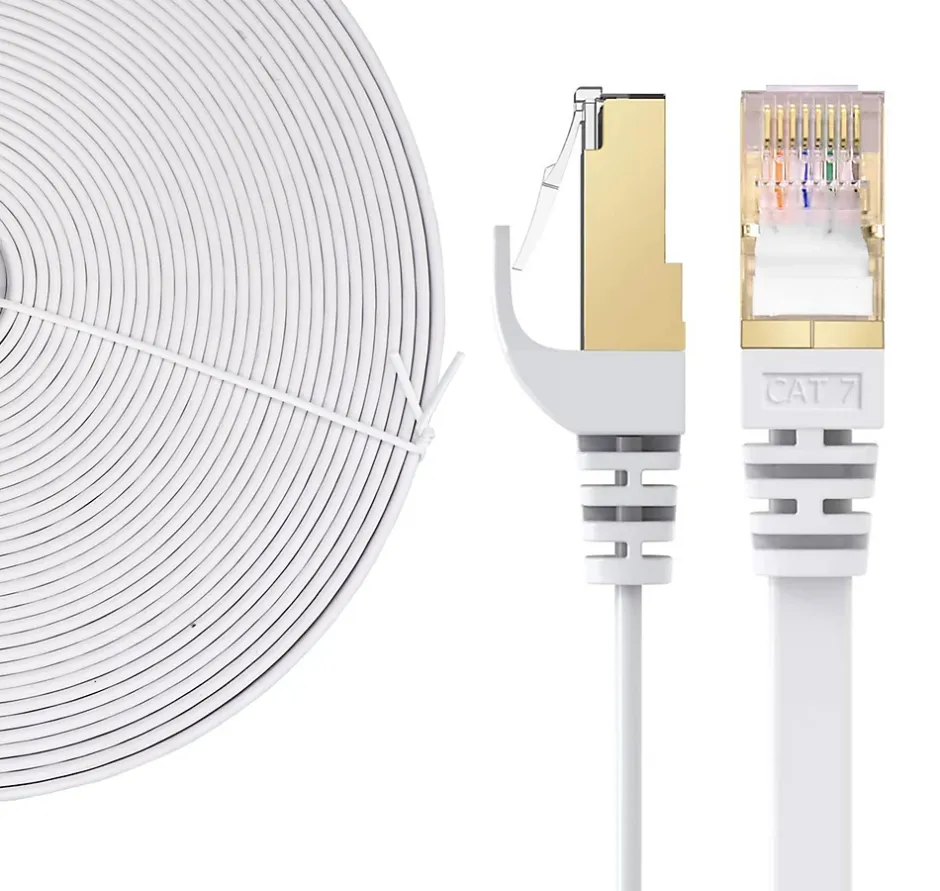 Description généraleCe câble Ethernet RJ45 Cat 7 plat blanc est conçu pour allier esthétique et performance. Sa forme ultra-plate lui permet de se glisser discrètement le long des murs, sous les tapis ou derrière les meubles. Il offre une vitesse de 10 Gbps avec un blindage S/FTP efficace contre les interférences, garantissant une transmission stable et rapide.Spécifications techniquesCatégorie : Cat 7 (RJ45)Vitesse : jusqu’à 10 GbpsBande passante : 600 MHzType : câble plat ultra-finBlindage : S/FTP (paires blindées + feuillard global)Conducteurs : cuivre sans oxygène (OFC)Connecteurs : RJ45 mâles plaqué orLongueurs aux choixCouleur : blancCompatibilité : Cat 5e, Cat 6, Cat 6a, Cat 7Compatibilité et accessoiresCompatible avec tous les équipements RJ45 : routeurs, TV, consoles, NAS, PC, imprimantes réseauUtilisation : gaming, streaming UHD, télétravail, domotique, entrepriseInstallationFacile à dérouler et à dissimuler, ce câble plat s’installe sans outil spécial. Idéal pour les logements modernes, les bureaux design ou les réseaux domotiques.UtilisationConçu pour les usages intensifs et connectivités exigeantes, il garantit un débit constant pour les activités gourmandes en bande passante.Autres informationsChaque câble est testé individuellement pour garantir conformité et performance. Son design plat blanc s’intègre harmonieusement à tout environnement moderne.