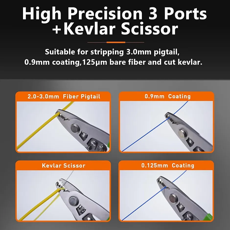 Description généraleLe kit Elfcam Pro Tools comprend une pince à dénuder fibre optique 3 trous et des ciseaux de coupe pour kevlar. Conçus pour les techniciens FTTH, ces outils permettent le dénudage précis des pigtails 3.0 mm / 0.9 mm / 125 µm ainsi que la coupe nette des gaines de protection en kevlar.Fabriqués en acier inoxydable 420 trempé (dureté > 53HRC), ces outils professionnels offrent une grande durabilité, une prise en main confortable et une fiabilité optimale dans tous les environnements de déploiement fibre optique.Spécifications techniques Outils inclus : pince à dénuder 3 fentes + ciseaux kevlar Pince à dénuder : 125 µm (fibre nue), 250 µm, 900 µm, pigtails 3.0 mm Matériau : acier au carbone trempé Ciseaux : Lames microdentées – découpe précise du kevlar Matériau : acier inoxydable 420 – Dureté > 53HRC Poignée : ergonomique avec revêtement antidérapant Compatibilité fibre : SM 9/125, MM 50/125, 62.5/125Compatibilité et applications Compatible avec : fibres optiques monomode et multimode Applications : FTTH, FTTB, data centers, LAN/WAN, installation clientInstallationChoisissez la fente appropriée sur la pince selon le diamètre de gaine. Insérez la fibre jusqu’à la butée, fermez la pince, puis tirez fermement. Utilisez les ciseaux pour couper le kevlar ou les gaines de protection internes.UtilisationParfait pour les techniciens fibre intervenant en déploiement, raccordement ou réparation. Assure un travail rapide, propre et sécurisé pour préparer les fibres à la soudure ou à la connectique.Autres informationsLivré avec service client Elfcam 24/7 en France. C’est un outil essentiel pour tout professionnel du réseau optique. Robuste, fiable et conçu pour durer.Images du produit