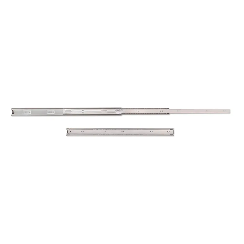 Coulisses à billes à sortie totale fabriquées en acier zingué. Guide de hauteur 45 mm. Les vis de montage ne sont pas incluses. Avec gâchette pour le démontage. Charge maximum 30 kg. Fournies par jeu complet gauche et droite. Gâchette pour le démontage de la coulisse.