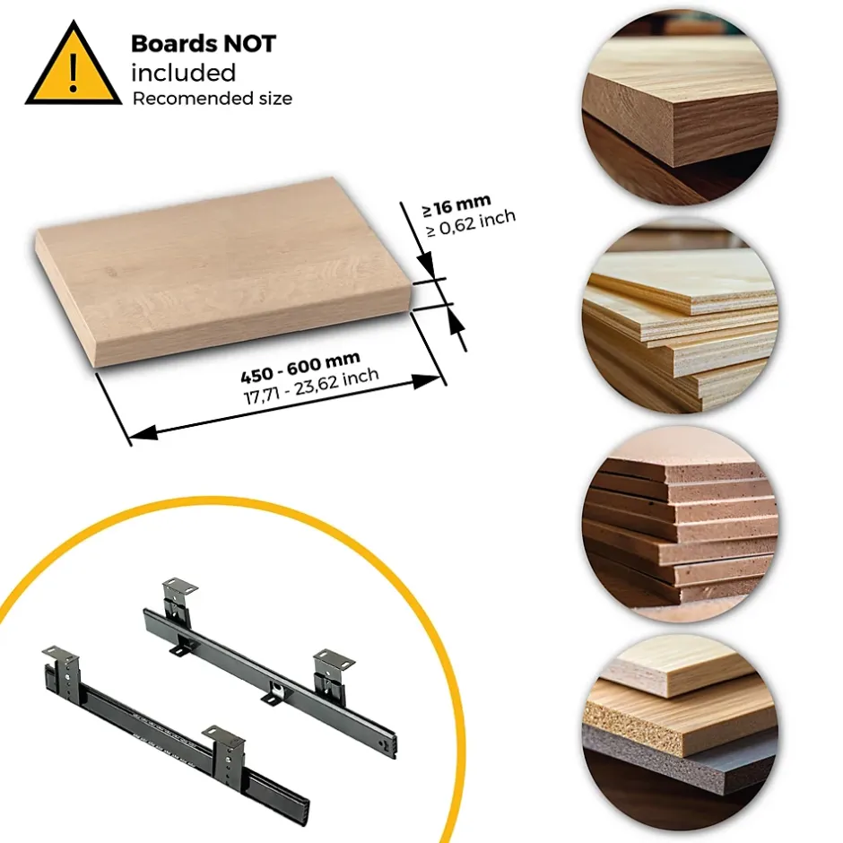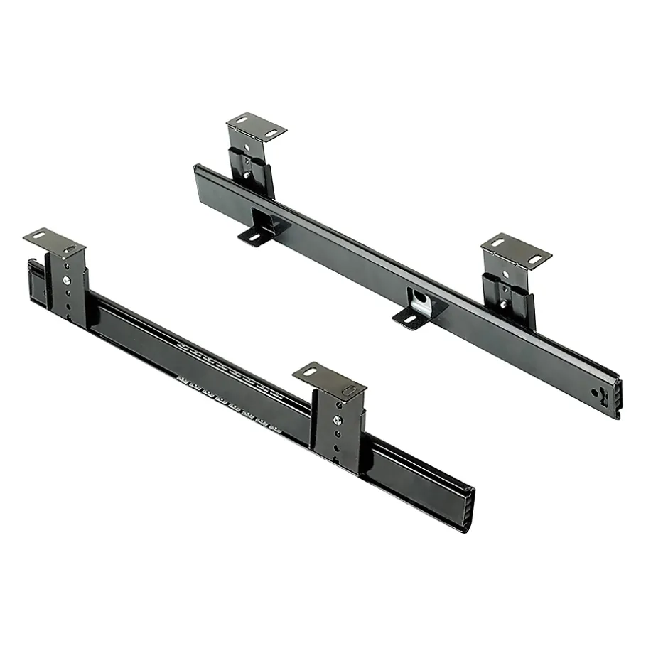 Coulisses porte-clavier pour supports de clavier, conçues pour un usage intensif sur les bureaux ou le mobilier technique.Hauteur réglable sur 6 positions, pour adapter le plateau du clavier à une position ergonomique en fonction des besoins de l’utilisateur.Montage sous le bureau, avec des languettes qui peuvent être orientées vers l’intérieur ou vers l’extérieur pour s’adapter à l’espace disponible sous la table.Recommandées pour les panneaux d’une épaisseur minimale de 16 mm et d’une largeur comprise entre 450 et 600 mm (non inclus). L’utilisation de vis à bois de 4×12 mm est recommandée.Fabriquées en acier avec une finition zingué noir, elles supportent jusqu’à 20 kg de charge et garantissent résistance et durabilité. VOIR LES MESURES DU PRODUIT DANS LES IMAGES. Coulisses à billes porte-clavier avec réglage en hauteur. Spécialement conçues pour les meubles de bureau et les tables de travail.