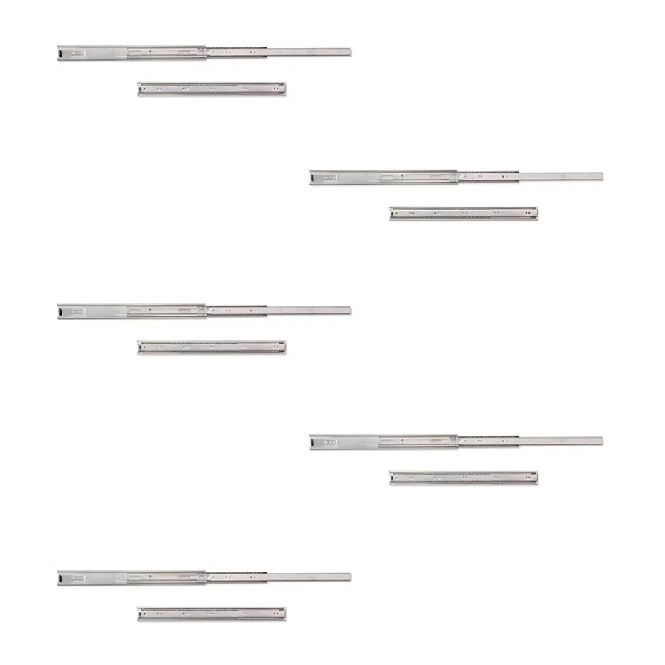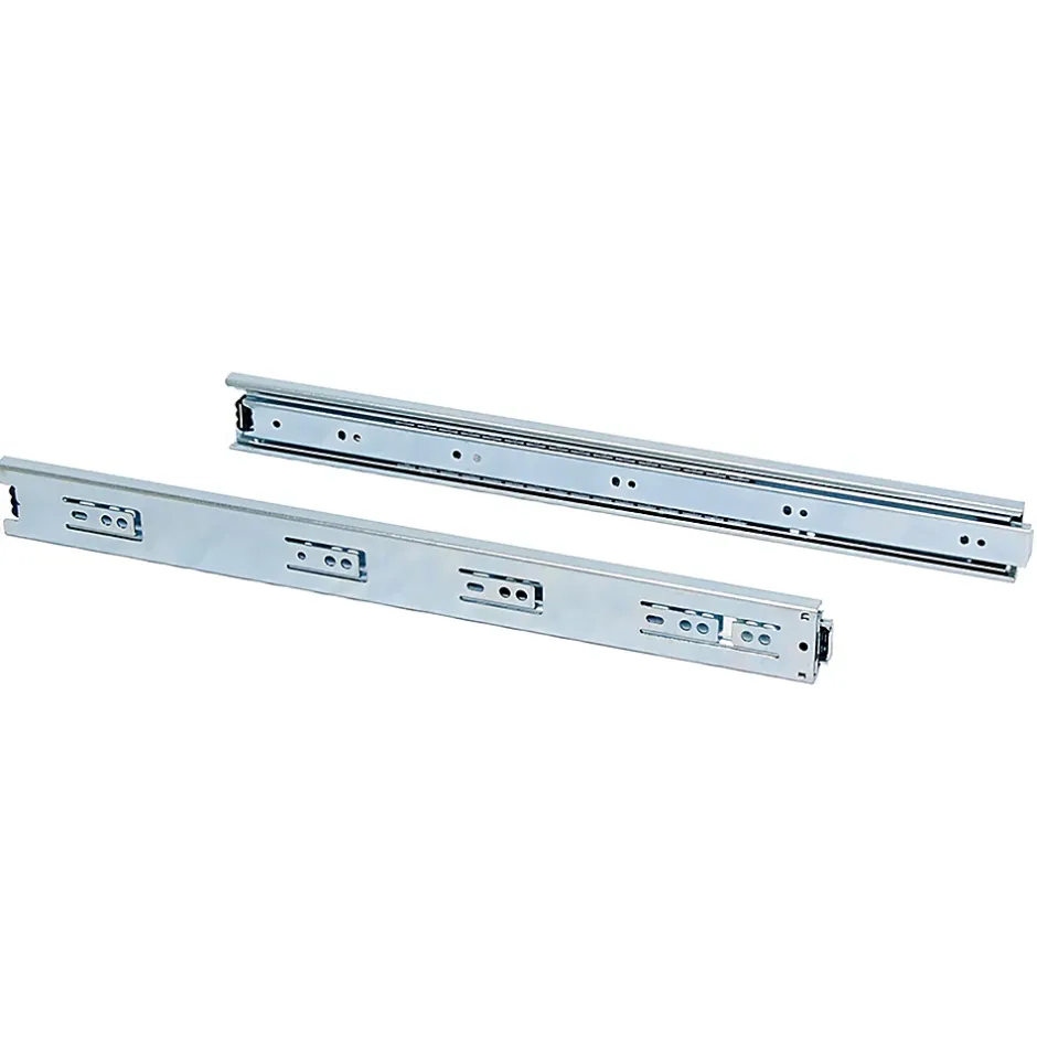 Coulisses avec roulements à billes et sortie totale du tiroir.Fabriquées en acier zingué.Hauteur 45 mm.Longueur 450 mm.Charge maximum par jeu 30 kg.Fournies par jeux complets.Gâchette pour le démontage de la coulisse. VOIR LES MESURES DU PRODUIT DANS LES IMAGES. Coulisses à billes à sortie totale fabriquées en acier zingué. Guide de hauteur 45mm. Les vis de montage ne sont pas incluses. Avec gâchette pour le démontage. Charge maximum 30kg.
