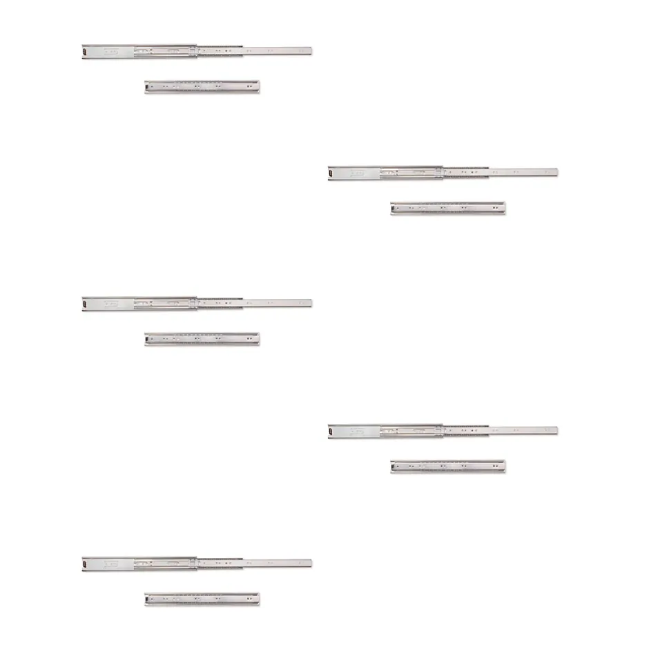 Coulisses à billes à sortie totale fabriquées en acier zingué, hauteur 45 mm, longueur 350 mm, charge maximum 30 kg par paire. Livrées en lot de 5 paires complètes avec gâchette pour démontage facile. Solution durable et fiable pour tiroirs en bois, mélaminé ou métallique.