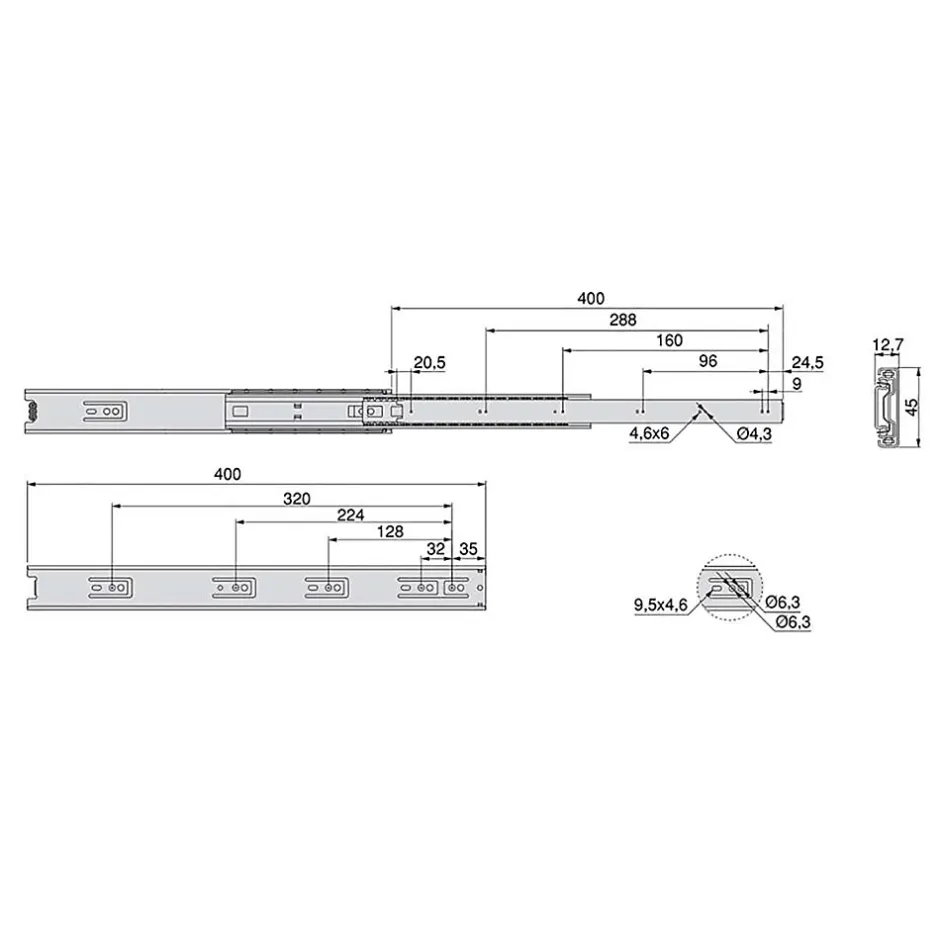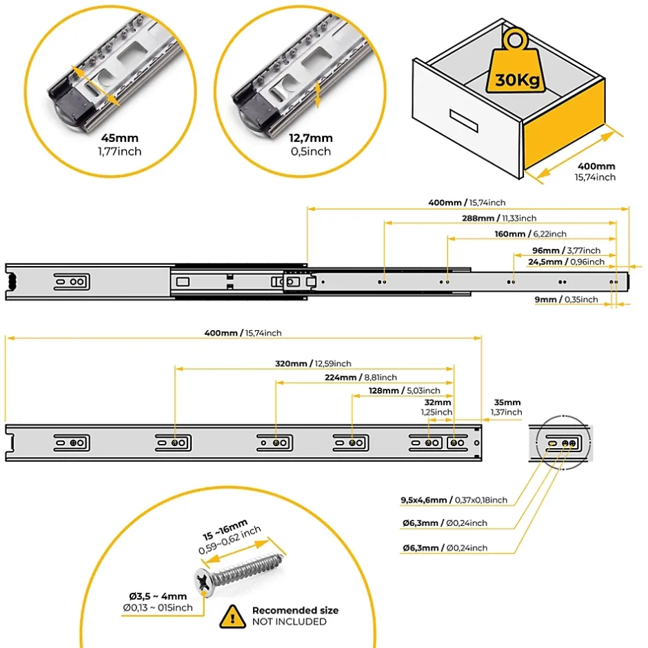 - Hauteur guide 45 mm, longueur 400 mm, coulissement total du tiroir.