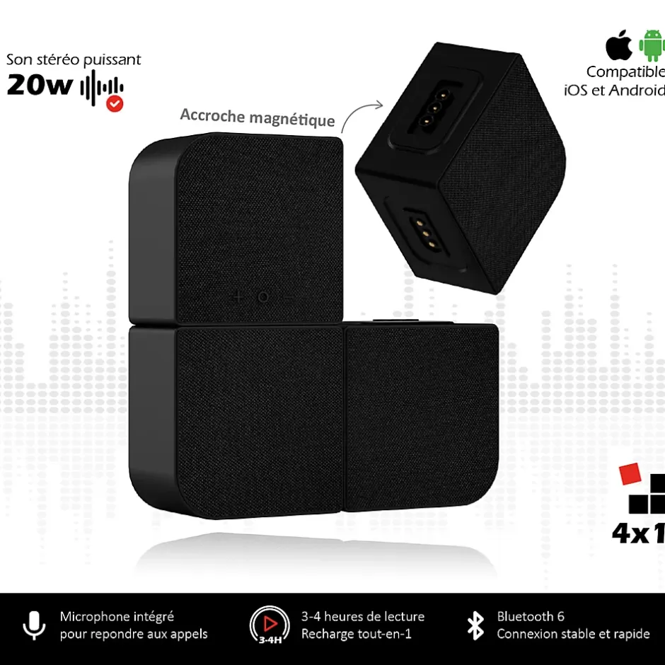 KYF-SOUND-003 Mini Mur d’Enceintes Bluetooth 6.0 Modulable 20WDécouvrez le KYF-SOUND-003, un mini mur d’enceintes Bluetooth 6.0 compact et modulable. Avec 20W RMS de son clair et puissant, ses 4 enceintes magnétiques peuvent être utilisées ensemble ou séparément, offrant une flexibilité unique pour une expérience audio personnalisée, à la maison ou en déplacement.Points forts Son puissant 20W RMS : 4 enceintes de 5W pour un son clair et immersif. Bluetooth 6.0 : Connexion stable jusqu’à 28 m en champ libre. Design modulable : Enceintes séparables ou regroupables grâce à un système magnétique. Polyvalence : Lecture via Bluetooth, AUX 3,5 mm ou micro SD (jusqu’à 32 Go). Autonomie : 3 à 4 heures d’écoute, recharge rapide en 1,5 à 2,5 heures via USB-C. Mains libres : Microphone intégré pour des appels clairs. Appairage multiple : Connectez plusieurs enceintes pour un son amplifié. Portable : Compact (8 x 8 cm par enceinte) et léger, en ABS robuste.Caractéristiques techniques Audio : 4 haut-parleurs 45 mm (5W chacun), 20W RMS, impédance 4 Ω, réponse en fréquence 200 Hz – 18 kHz, rapport signal/bruit ≥ 80 dB, distorsion ≤ 0,5 %. Batterie : 4 x 1200 mAh (4800 mAh total), 3,7V–4,2V, charge via USB-C (5V/1A), autonomie 3-4h, charge 1,5-2,5h. Connectivité : Bluetooth v6.0 (bande 2,402–2,480 GHz, puissance 8 mW), portée 28 m, entrées AUX 3,5 mm et micro SD (jusqu’à 32 Go, non incluse). Fonctions : Appairage multiple automatique, mains libres. Dimensions : 16 x 16 cm (4 enceintes de 8 x 8 cm), matériau ABS haute qualité.Idéal pour Créer un mur sonore personnalisé à la maison ou en extérieur. Profiter de la musique en voyage, au bureau ou en camping. Connecter plusieurs enceintes pour un son stéréo amplifié. Utiliser en solo ou en groupe grâce au design magnétique modulable.Contenu de l’emballage 4 enceintes Bluetooth modulables Câble USB-C (50 cm) Manuel d’utilisation (français)