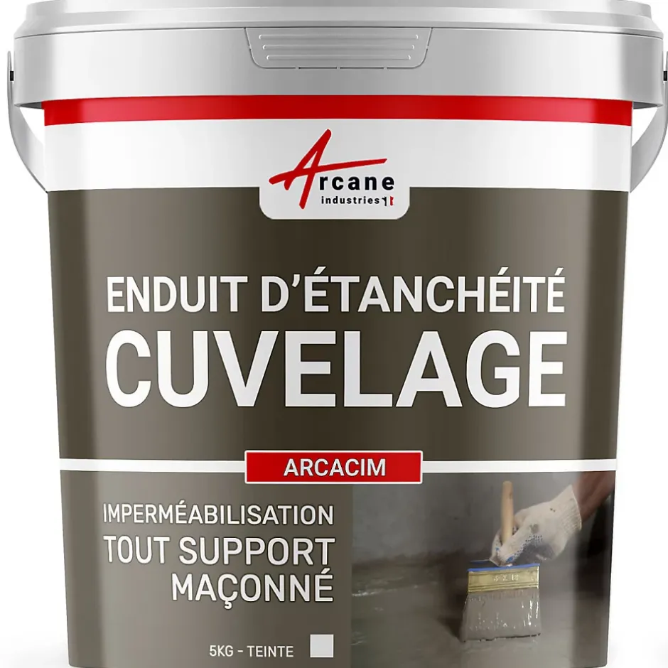 Enduit d’étanchéité pour mur, béton et maçonnerie, ARCACIM assure une protection hydrofuge définitive. Revêtement résistant à la contre-pression, il isole de l’humidité et des infiltrations sous-sol, fondation, fosse d’ascenseur, vide sanitaire. Il s’applique sur le béton, enduit ciment, parpaing, briques, pierre.CONSOMMATIONSur béton banché / Enduits : 2 couches : total : 3 kg/ m²1ère couche à la brosse : 1,5 kg par m²2ème couche à la lisseuse: 1,5 kg par m²Sur parpaing : 2 couches : total : 4 kg/ m²1ère couche à la brosse : 2,5 kg par m²2ème couche à la lisseuse: 1,5 kg par m²Application : En tant que fabricant Français, nous mettons à disposition un document PDF disponible en bas de page vous indiquant les informations produits ainsi que les consignes d’application.La plateforme ne permet pas encore le regroupement des différents modèles. Pour voir toutes les contenances et toutes les couleurs, tapez ou copier-coller les termes suivants dans la barre de recherche : Enduit Hydrofuge pour support maçonné – ARCACIM