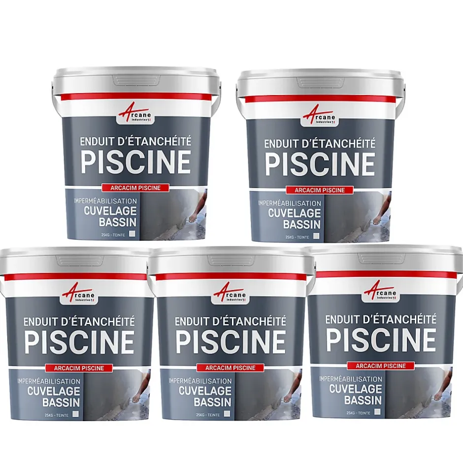 Enduit d’étanchéité piscine ARCACIM PISCINE est un enduit de cuvelage piscine de haute performance, conçu pour garantir une étanchéité parfaite et une protection durable contre les pressions d’eau et contrepressions des bassins et piscines.Fabriqué en France depuis 1995, cet enduit bénéficie de notre expertise reconnue, offrant une résistance exceptionnelle à tous les traitements d’eau et une adhérence parfaite sur tous supports maconnés poreux. Efficace, même dans les environnements les plus exigeants.CONSOMMATIONSur béton banché / Enduits : 3 couches* : total : 4,5 kg/ m²- 1ère couche à la brosse : 1,5 kg par m²- 2ème couche à la lisseuse: 1,5 kg par m²- 3ème couche à la lisseuse: 1,5 kg par m²Sur parpaing : Application préalable d’un enduit hydrofuge de 1 à 2 cm puis 3 couches* : total : 4,5 kg/ m²- 1ère couche à la brosse : 1,5 kg par m²- 2ème couche à la lisseuse: 1,5 kg par m²- 3ème couche à la lisseuse: 1,5 kg par m²(*) Si la hauteur d’eau n’excède pas 1 mètre, 2 couches d’ARCACIM PISCINE suffisent (3 kg par m² au total).Application : En tant que fabricant Français, nous mettons à disposition un document PDF disponible en bas de page vous indiquant les informations produits ainsi que les consignes d’application.La plateforme ne permet pas encore le regroupement des différents modèles. Pour voir toutes les contenances et toutes les couleurs, tapez ou copier-coller les termes suivants dans la barre de recherche : Enduit Piscine Hydrofuge – Etanchéité Piscine & Cuvelage : ARCACIM PISCINE