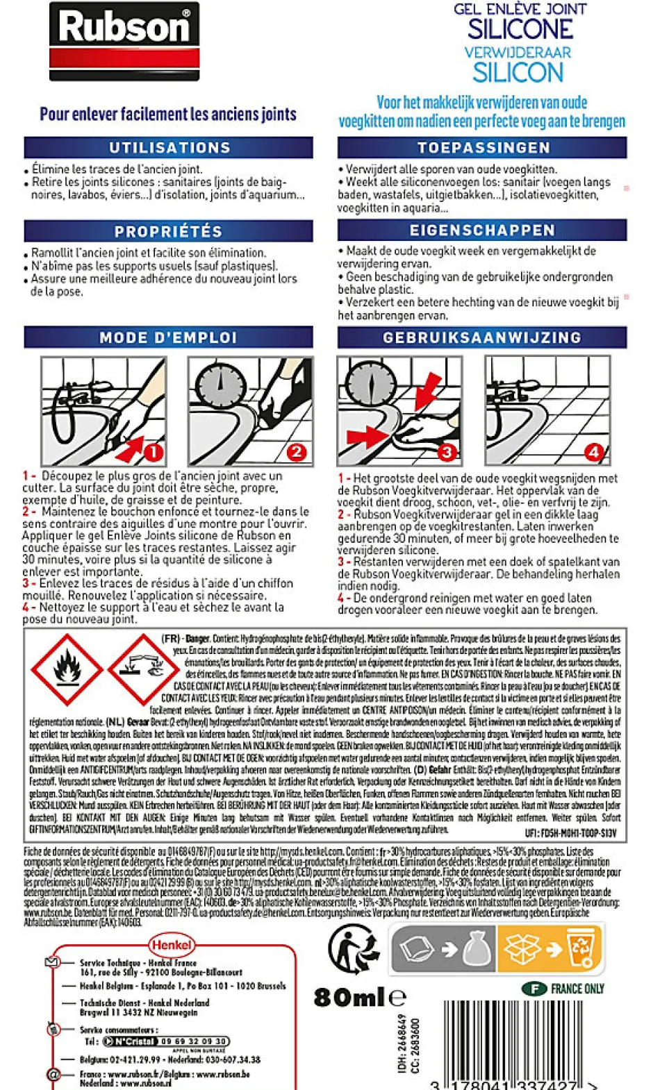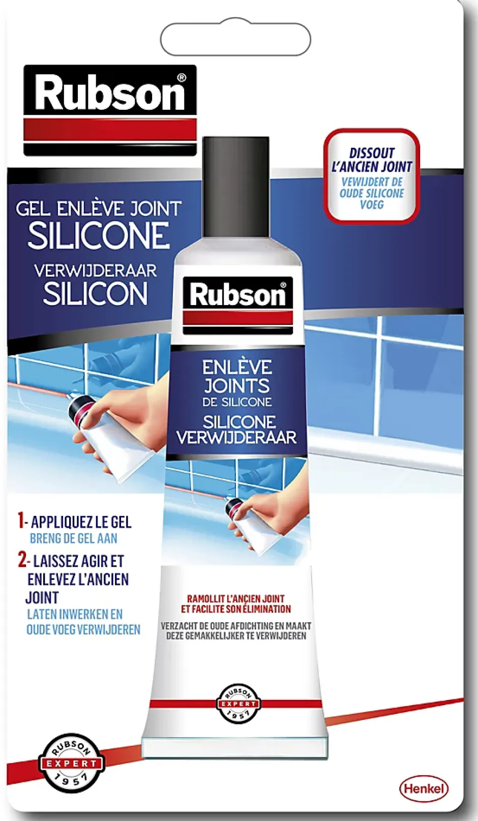RUBSON Enlève Joints Silicone, le gel qui dissout les anciens joints. Ce gel permet de retirer les anciens joints de silicone en un tour de main. Facile à utiliser, il ramollit les anciens joints afin de faciliter leur retrait total et de garantir une meilleure adhérence lors de la pose du nouveau joint et il n’abîme pas les supports, évitez l’application sur revêtements muraux en plastique. Ce décolle joint convient à la plupart des joints silicones sur baignoire, lavabo, évier, battants de porte et fenêtre, aquariums, etc. Pour tout autre supports, veuillez contacter notre service technique.