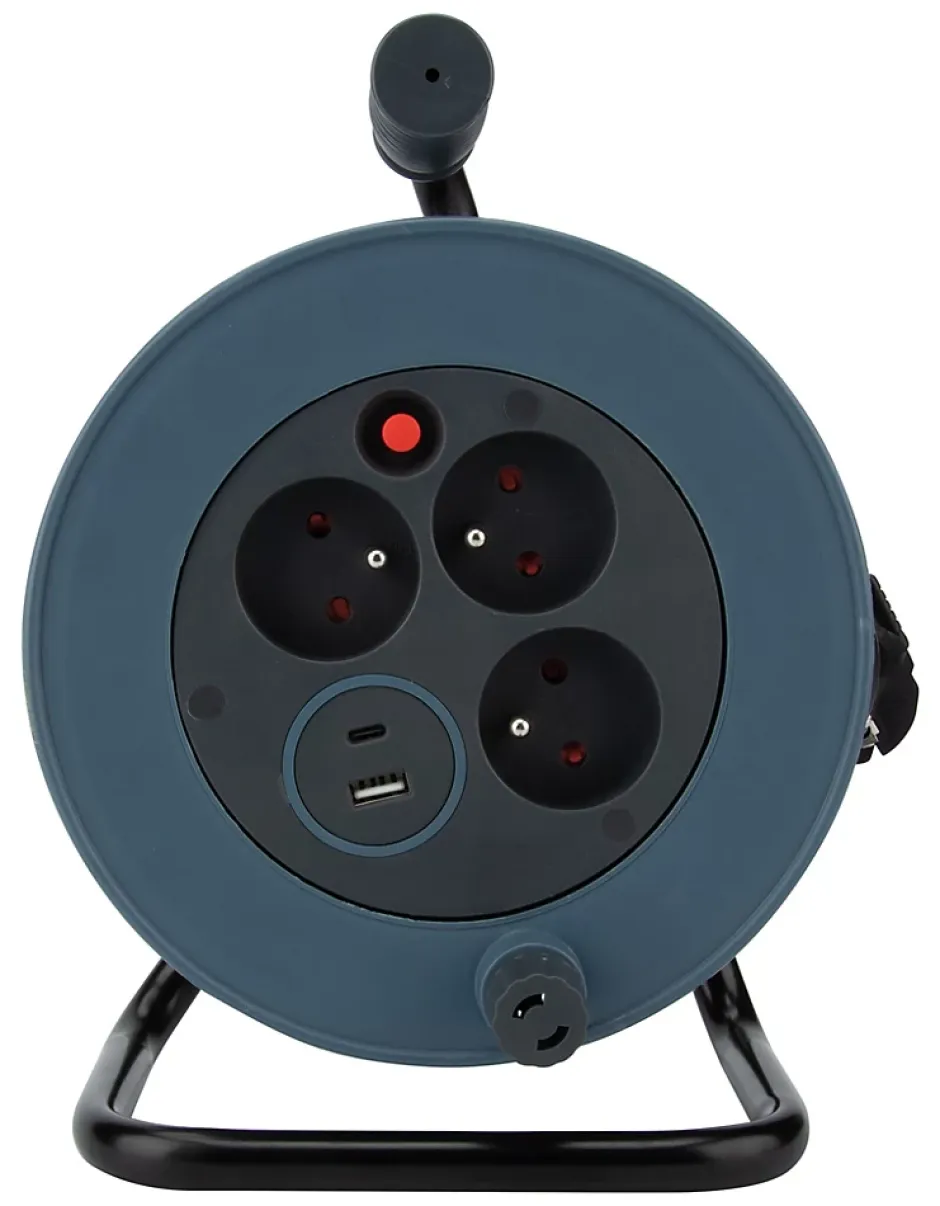 Enrouleur compact 3 prises. Couleur(s) : bleu ou gris. 3 prises 2P+T 16A. 2 Ports USB (type A+Type C) 2,4A. Câble H05VV-F 3G1 mm². Longueur de câble : 12m. Protection thermique et de surcharge : 1100W (câble enroulé) et 2300W (câble déroulé)