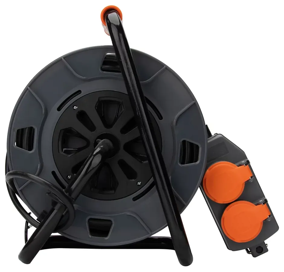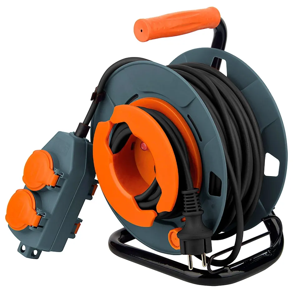 Enrouleur 4 prises déportées. Couleur(s) : orange. 4 prises 2P+T 16A équipées de clapets de protection. Longueur du câble : 30 mètres. Type de câble : H05VV-F 3G1,5 mm². Puissance max : 1000W câble enroulé 3000W câble déroulé. Protection thermique intégrée contre les surcharges. Norme : conformité NF