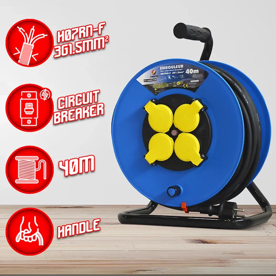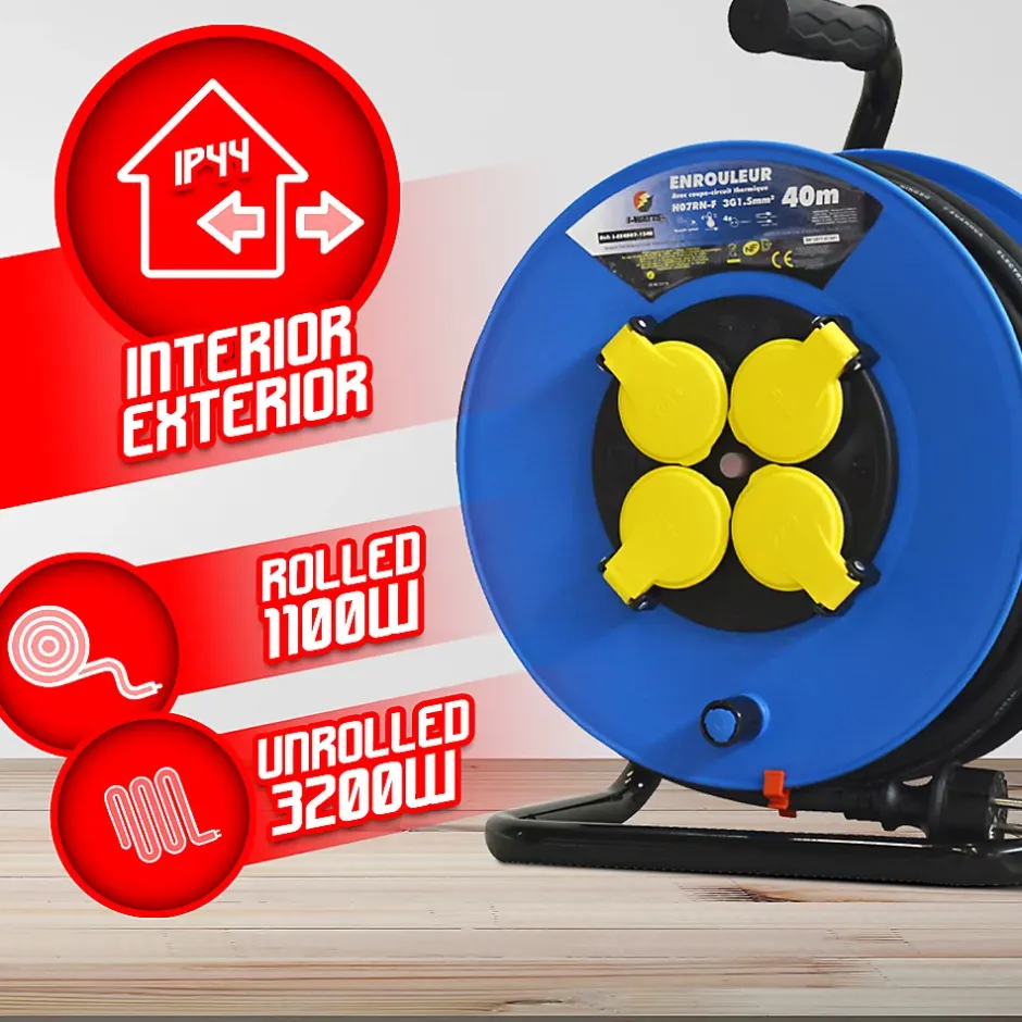 H07RN-F – 3G1,5mm²Longueur: 40m4 prises à clapetUsage intérieur/extérieur – IP44Approuvé NFProtection enfantDisjoncteur thermiquePuissance max déroulé: 3200WPuissance max non déroulé: 1100W