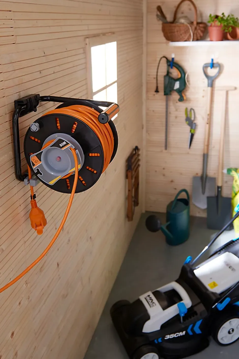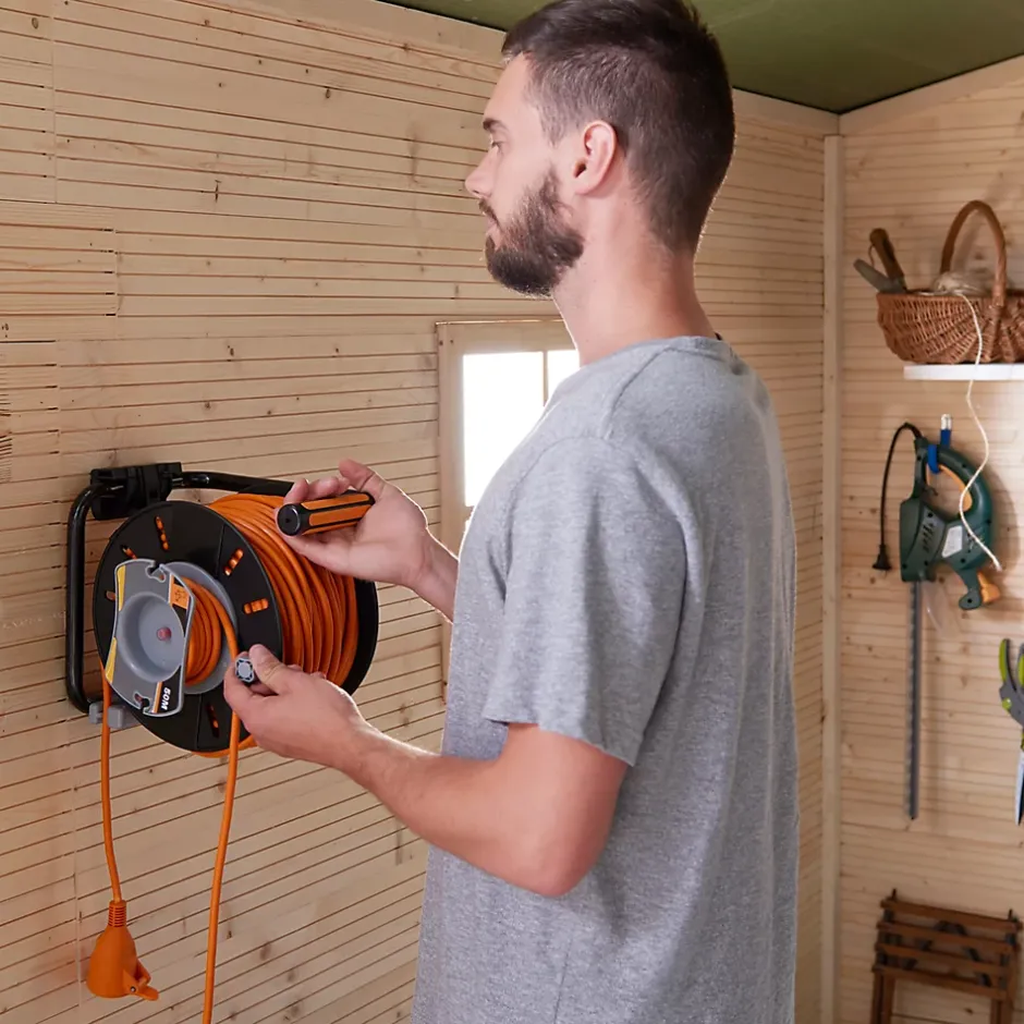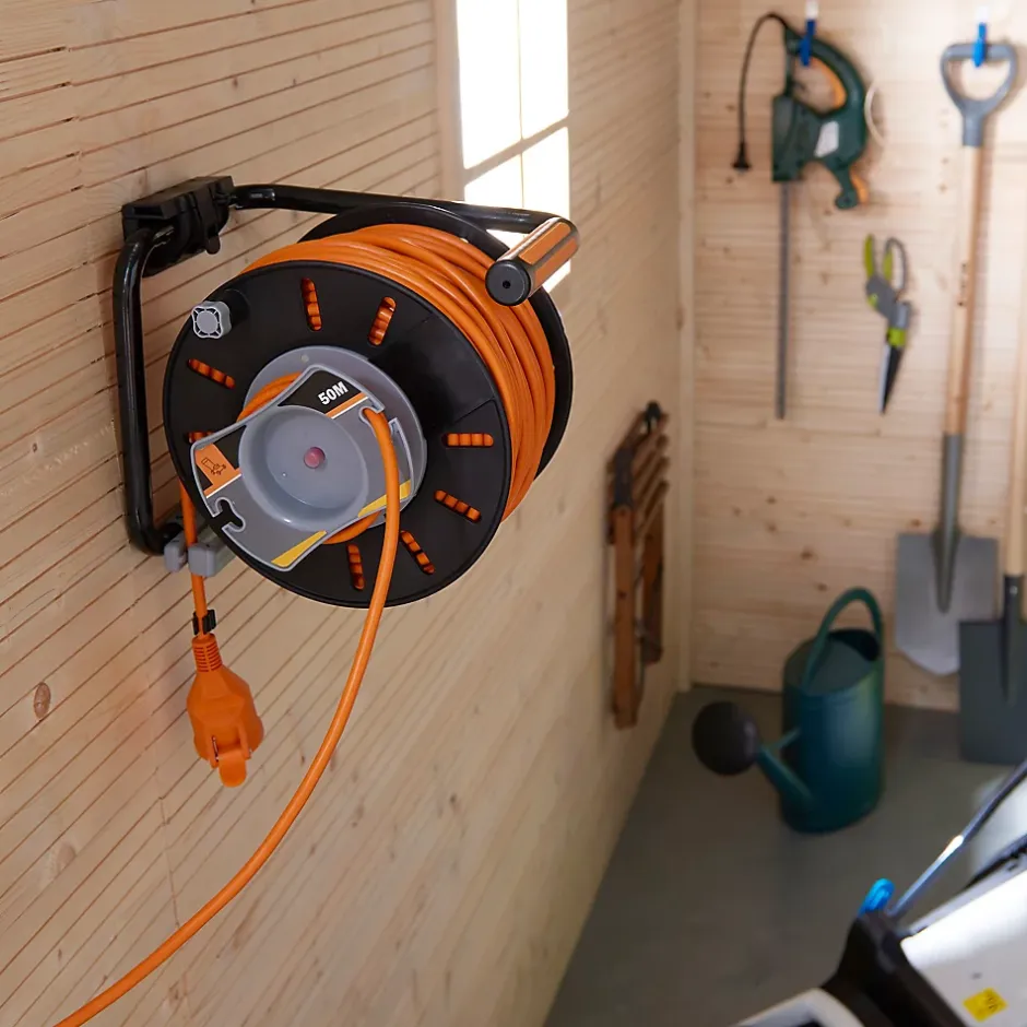 Pouvant contenir jusqu’à 50 m de câble, ce dévidoir de câble à rembobinage est idéal pour profiter de vos outils avec plus d’autonomie et faciliter et sécuriser l’entretien de votre jardin grâce à son câble orange.