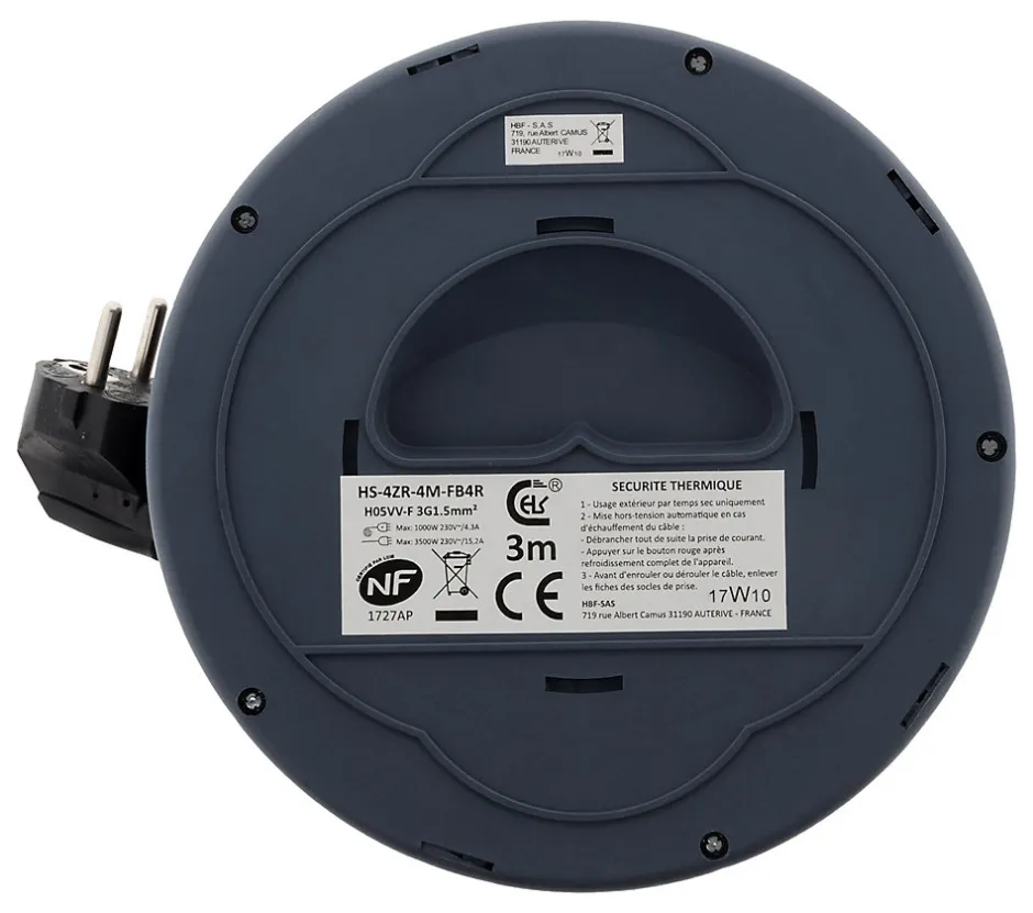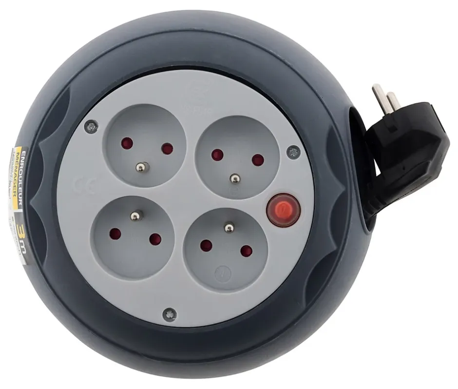 Enrouleur domestique 3 prises. Couleur(s) : gris. 4 prises 2P+T 16A. Longueur du câble : 3m. Câble H05VV-F 3G1mm². Protection thermique et de surcharge : 1000W (câble enroulé) et 3000W (câble déroulé). Norme(s) : NF