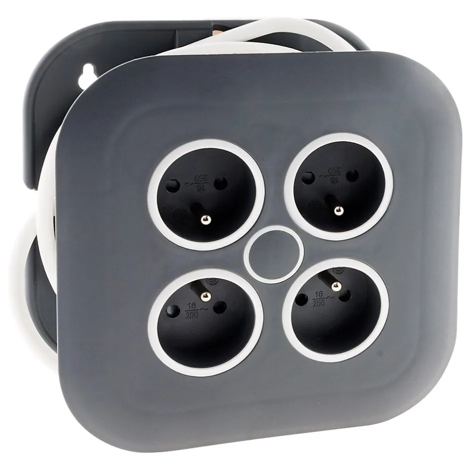 Enrouleur domestique. Plusieurs coloris au choix. Enrouleur 4 prises 2P+T 16A. Coupe circuit thermique. Câblé en H05VV-F 3G1mm². Longueur : 7m
