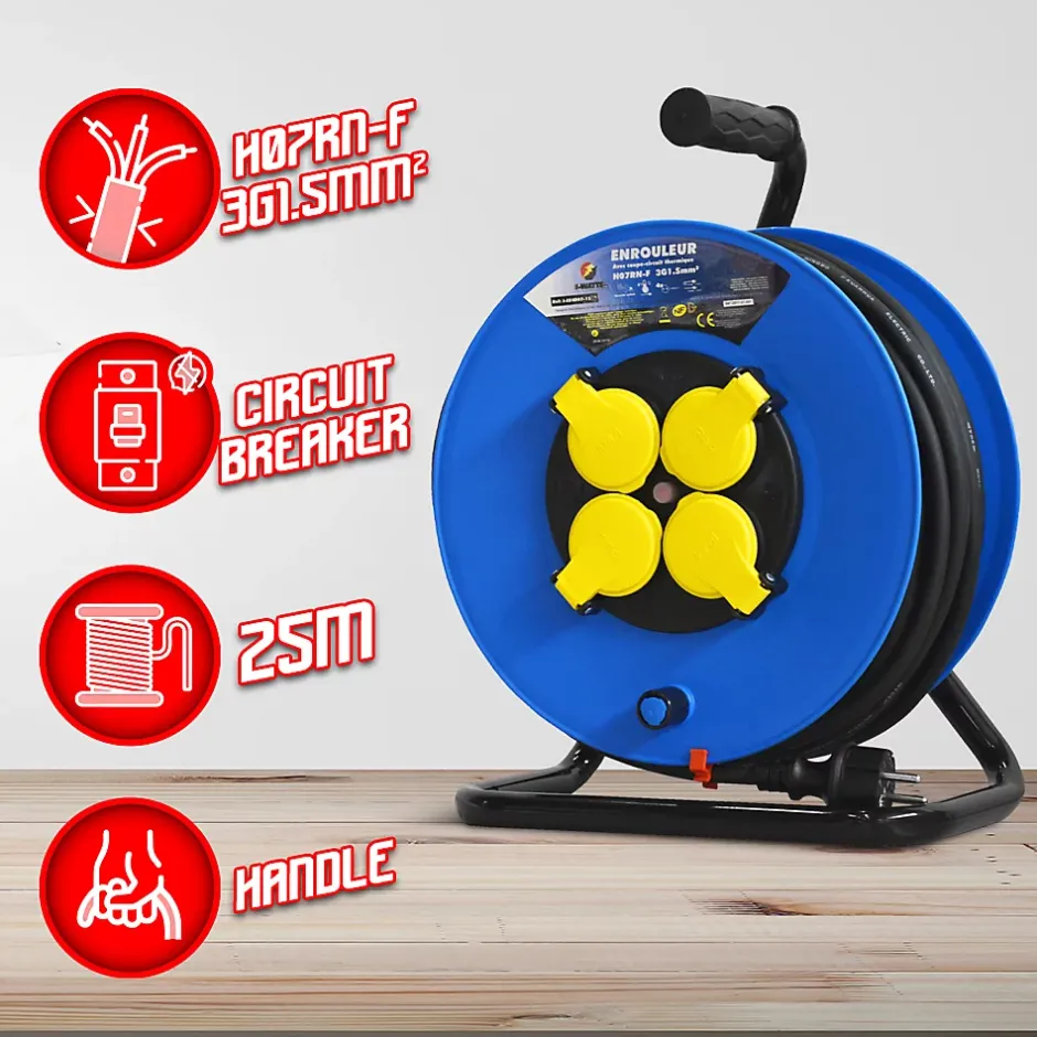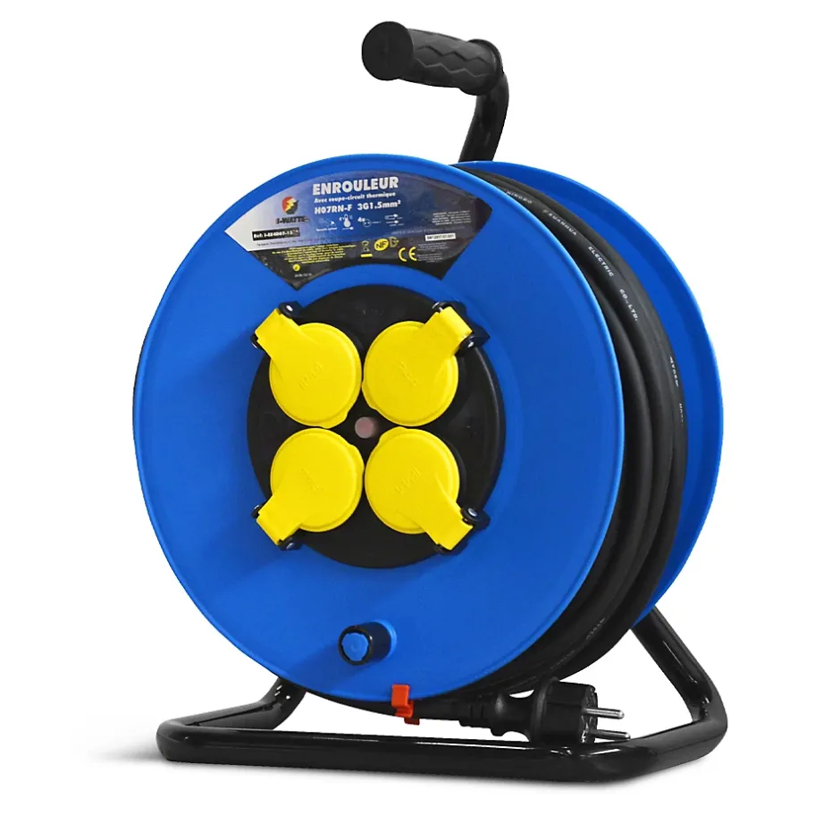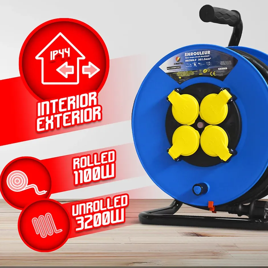Cet enrouleur électrique I-Watts Pro de 25 mètres est conçu pour une utilisation intensive en intérieur comme en extérieur grâce à son indice de protection IP44. Équipé d’un câble professionnel H07RN-F 3G1,5mm², il garantit robustesse, sécurité et performance pour tous vos travaux de bricolage, chantier ou jardinage.Sa longueur de 25 mètres offre une grande liberté de mouvement, idéale pour alimenter vos outils électriques même à distance. Il dispose de 4 prises avec clapets de protection pour une utilisation sécurisée en milieu poussiéreux ou humide.Cet enrouleur supporte une puissance maximale de 3200W lorsque le câble est entièrement déroulé et 1100W lorsqu?il est enroulé, permettant d’alimenter efficacement vos appareils électriques tout en évitant les risques de surchauffe. Le disjoncteur thermique intégré protège automatiquement contre les surcharges et assure une sécurité optimale.Caractéristiques:- H07RN-F – 3G1,5mm²- Longueur: 25m- 4 prises à clapet- Usage intérieur/extérieur – IP44- Approuvé NF- Protection enfant- Disjoncteur thermique- Puissance max câble déroulé: 3200W- Puissance max câble non déroulé: 1100W
