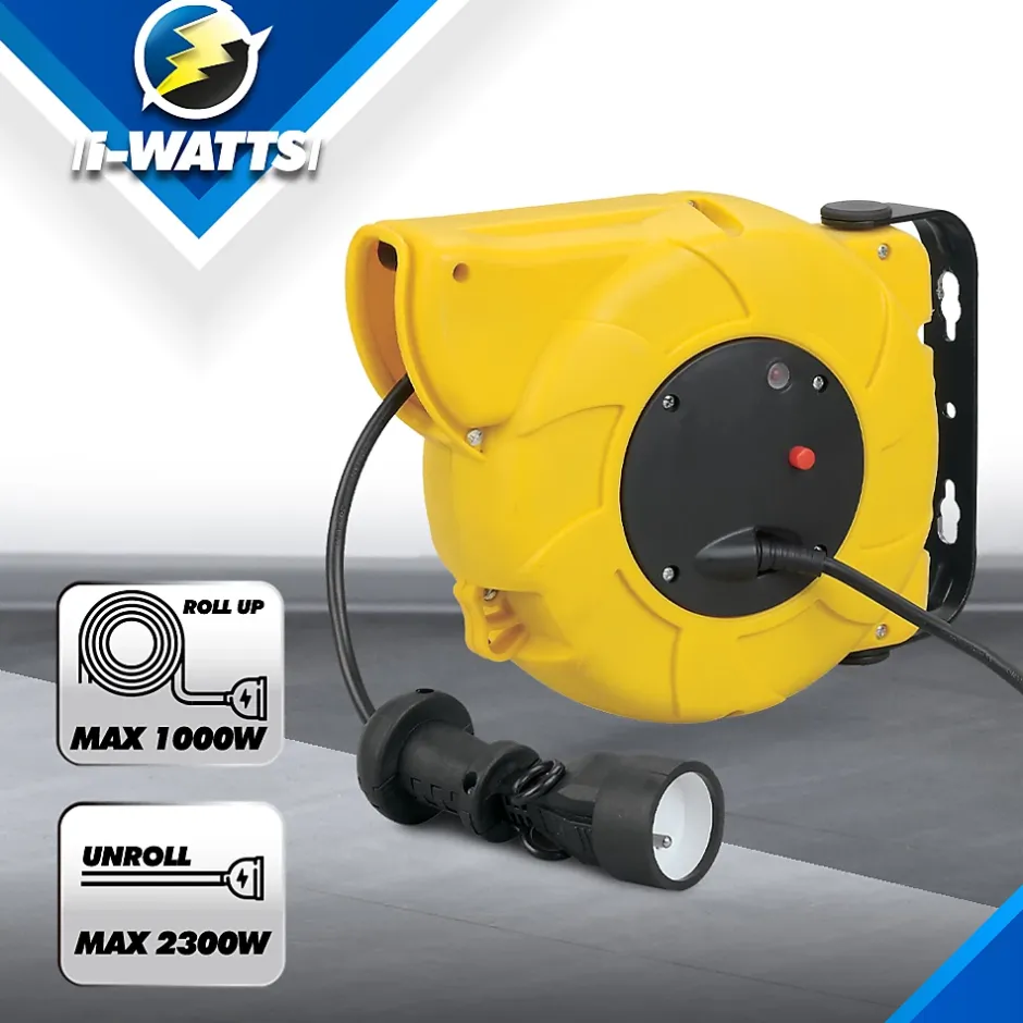 Enrouleur mural automatique I-WATTS 18 m HO5VV-F 3×1,5 mm² avec boîtier polypropylène jaune, pivot 180°, disjoncteur thermique intégré, puissance max déroulé 2300 W / enroulé 1000 W, IP20, fixation murale fournie, garantie 2 ans.