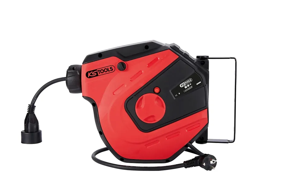 Enrouleur mural KS TOOLS 3×1,5 mm², câble 15 m, ressort de rappel et support orientable à 180°, disjoncteur thermique intégré, indice IP34, dimensions H 293 x l 155 mm, couleur rouge, puissance maxi 1 500 W enroulé / 2 000 W déroulé, tension d’utilisation 230 V / 50 Hz.