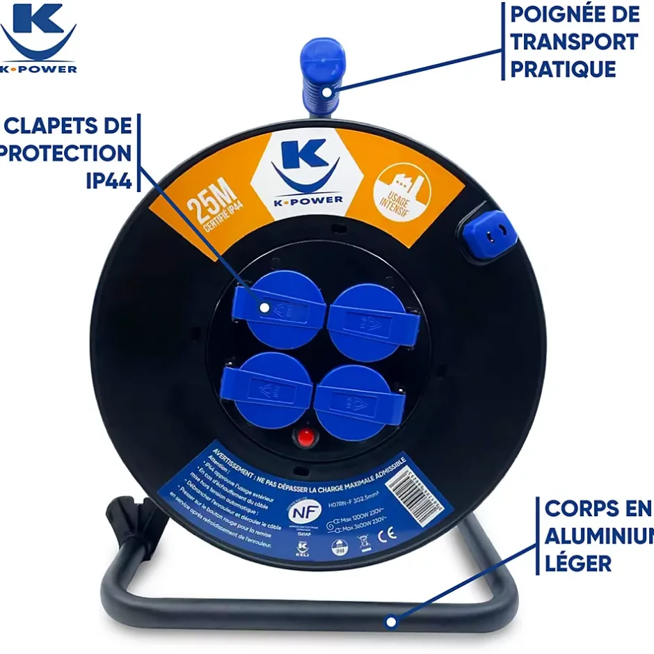 - CABLE & PRISES : Câble 3G2.5H07RNF très résistant – Socle de 4 Prises à Clapet IP44 garantissant une résistance aux projections d’eau de toutes directions. Parfait pour une utilisation intensive