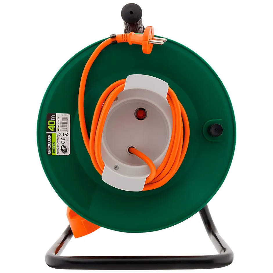 Enrouleur sans prise. Couleur(s) : orange. Puissance max 1100W enroulé ou 3200W déroulé sous 230V. Câblé en H05VV-F 2x 1,5mm². Plusieurs longueurs au choix. Avec poignée ergonomique. Pied en métal stable et robuste. Coupe circuit thermique fiche 6/16A. Permet de ranger votre rallonge électrique (fournie). Norme(s) : NF