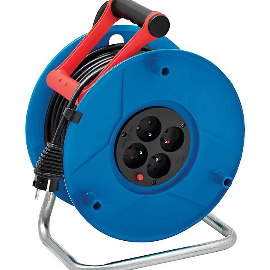 4 prises de courant 2P+T 16A/230V~.1 fiche 2P+T 16A/230V~.Puissance maxi : câble non déroulé 1000W – câble déroulé 3500W.Support en acier galvanisé.Poignée de transport ‘cablepilot’ pour un guidage parfait du câble, bascule de chaque côté pour un transport et une accroche facile (adapté aux gauchers comme aux droitiers), trous de rangement de la fiche prévus.Boutons ergots pour un enroulement facile du câble.Clip de fixation du câble pour assurer son maintien pendant le transport.Frein de tambour pour bloquer le câble durant le transport.Disjoncteur thermique.