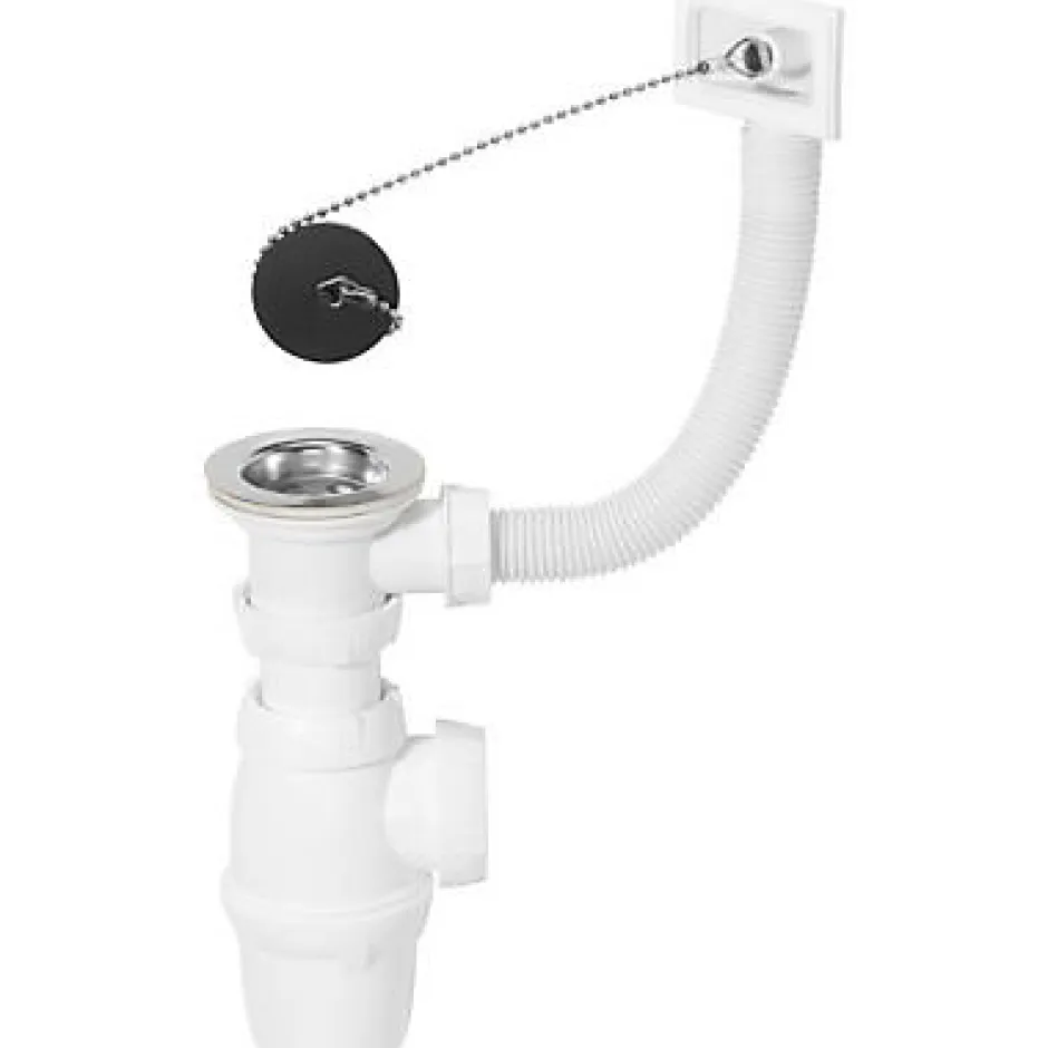 Cet ensemble complet avec trop plein + bonde à bouchon à chaînette 1 bac ø 50 mm Wirquin comprend un siphon réglable en hauteur de 131 à 176 mm avec trop plein rectangulaire.