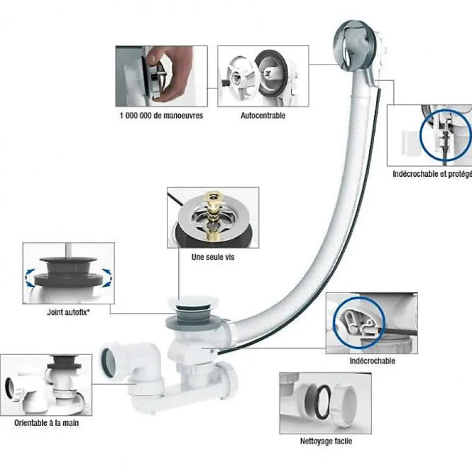 Mécanisme garanti, testé à plus de 1 million de manœuvres Pose facile : siphon à sortie orientable