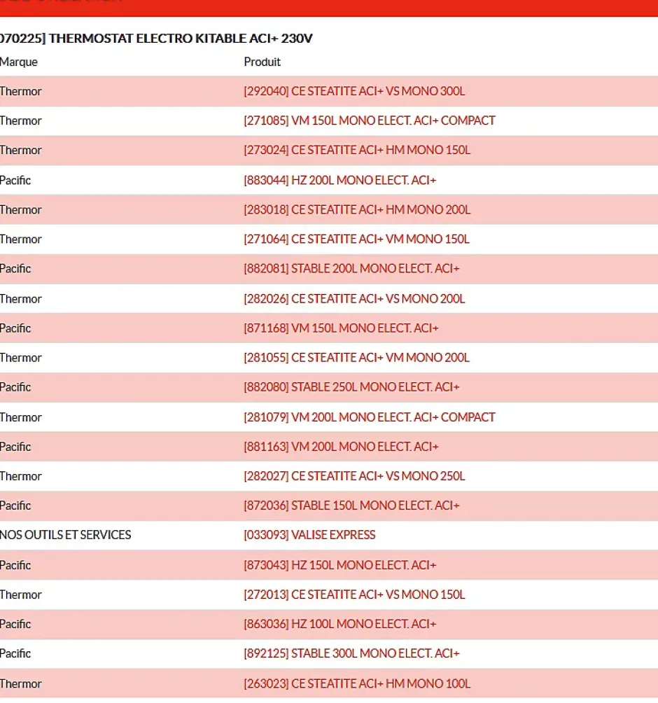 - Compatibilité indiquée avec références Thermor et certains modèles Atlantic (voir documentation constructeur pour liste de références compatibles).