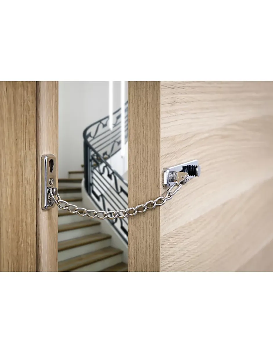 Cet entrebâilleur à chaîne en acier vous permet de sécuriser votre porte d’entrée. Ne craignez plus l’intrusion au moment d’ouvrir la porte à des inconnus. Adaptable sur toutes les types de porte, cet entrebâilleur Thirard bloquera votre porte en position entrebâillée et apportera une sécurité supplémentaire à votre maison ou appartement. Cet entrebâilleur de porte d’entrée est disponible en finition chromée ou dorée.