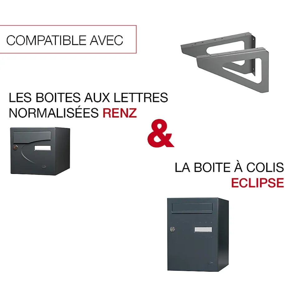 Paire d’équerres murales Renz de 175x250x30mm spécialement adaptée aux boîtes aux lettres Renz. Visserie fournie permettant la pose de la boîte aux lettres sur les équerres pré-percées. Livré avec visserie permettant la pose de la boîte aux lettres sur les équerres contre un mur ou un pilier, en bordure de propriété, à la hauteur recommandée. Coloris assorti à la boite aux lettres. Découpe intérieure pour pouvoir y déposer un journal. Garantie anti-corrosion de 15 ans. Pour une pose murale de votre boite aux lettres, optez pour les équerres de fixation murale qui garantissent une stabilité parfaite à votre boite. Leur découpe intérieure est spécialement conçue pour accueillir votre journal. Pour une parfaite harmonie avec votre boite aux lettres RENZ, ces équerres sont disponibles dans plusieurs coloris. Elles bénéficient d’une garantie de 15 ans anti-corrosion.Photos non contractuelles, se référer au RAL pour le coloris.