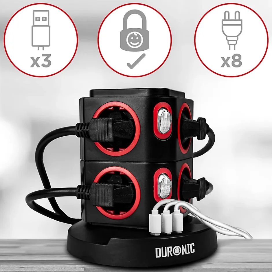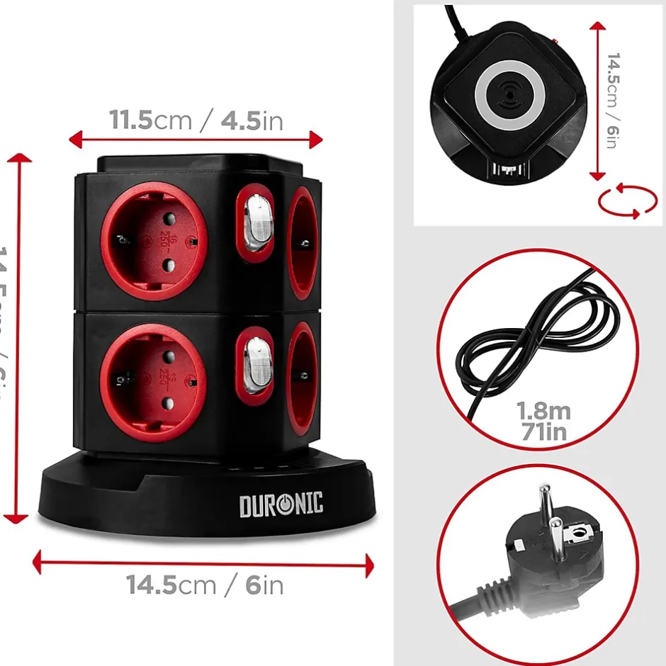 Découvrez la tour multiprise ET8W de Duronic conçue pour répondre à tous vos besoins. Avec 8 prises secteur et 3 ports USB, cette tour multiprise est un véritable outil polyvalent et efficace. Les dimensions compactes de cette tour multiprise sont de 14,5 x 14,5 x 14,5 cm. Le câble de 1,8 m de long permet d’avoir de la rallonge pour brancher vos appareils. Avec une puissance de 3680W, la tour ET8W offre une solution fiable pour charger tous vos appareils.Un port de recharge sans fil est également présent sur le haut de l’appareil de 1,1A, 9V et 10W, ce qui est idéal pour votre smartphone. Les 3 ports USB offrent une sortie de 5V et 2,4A, parfait pour vos petits appareils. Que vous soyez dans la cuisine, le salon ou la chambre à coucher, la tour d’extension ET8W est la solution idéale pour vos besoins en alimentation électrique. Dans la cuisine, vous pouvez alimenter divers appareils tels que les mixeurs, les cafetières, les grille-pains.Près de votre téléviseur et de votre centre de divertissement, cette tour vous permet de brancher des consoles de jeu, du matériel audio, des dispositifs de streaming et d’autres équipements de divertissement. Elle vous offre un accès facile et pratique à toutes vos sources de divertissement préférées.L’ET8W est le compagnon idéal pour vos voyages. Son format compact et sa prise de type C s’adaptent parfaitement à la plupart des prises électriques européennes. En voyage, vous pourrez étendre votre source d’alimentation en toute confiance. La fonction de protection contre les surcharges garantit la sécurité de vos appareils où que vous soyez. Sa forme de cube la rend facile à placer dans n’importe quelle pièce. Sa couleur rouge attrayante en fait un ajout élégant à votre décor intérieur.Que vous viviez dans une maison ancienne avec peu de prises électriques, que vous travailliez dans un atelier, un hôtel ou un bureau, la tour multiprise ET8W de Duronic est la solution qu’il vous faut pour étendre votre s