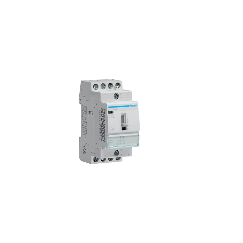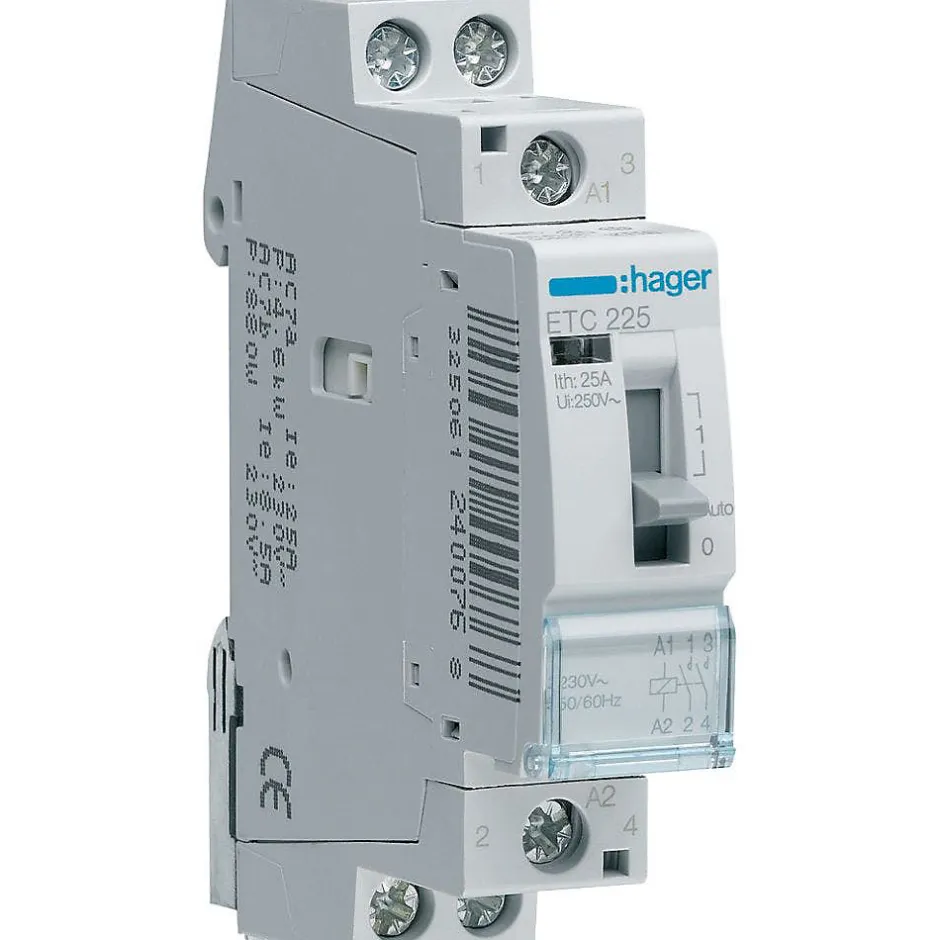 Contacteur de puissance ETC commande manuelle bobine 230V~ – 4P 230V~ – 25A – contact 4F – 2 modules Le contacteur jour nuit de la gamme ETC est fabriqué par Hager, il permet de mettre en marche votre chauffe eau en heures creuses (plage horaire où l’électricité est moins chères).Certifié NF, ce contacteur est équipé d’une bobine de tension 230Vca qui doit être protégée par un disjoncteur 2A conformément à la norme NF C 15-100.Le contacteur modulaire ETC425 de chez Hager est équipé de contacts à fermeture : 4F ou 4NO (contacts normalement ouverts).Le contacteur Hager ETC à commande manuelle intègre 3 positions visibles : AUTO, arrêt et marche forcée.Câblé via un système de bornes de raccordements à vis, ce contacteur jour/nuit triphasé occupe 2 modules de 18mm sur le rail DIN du tableau de votre installation.Points clés du contacteur jour nuit Hager ETC425 : Certifié NFBobine de tension 230VcaContacts 4NOPositions AUTO / Arrêt / Marche forcée.Fonctionne en heures creuses.Protéger la bobine par un disjoncteur 2A.Contacteur silencieux (bobine électronique).