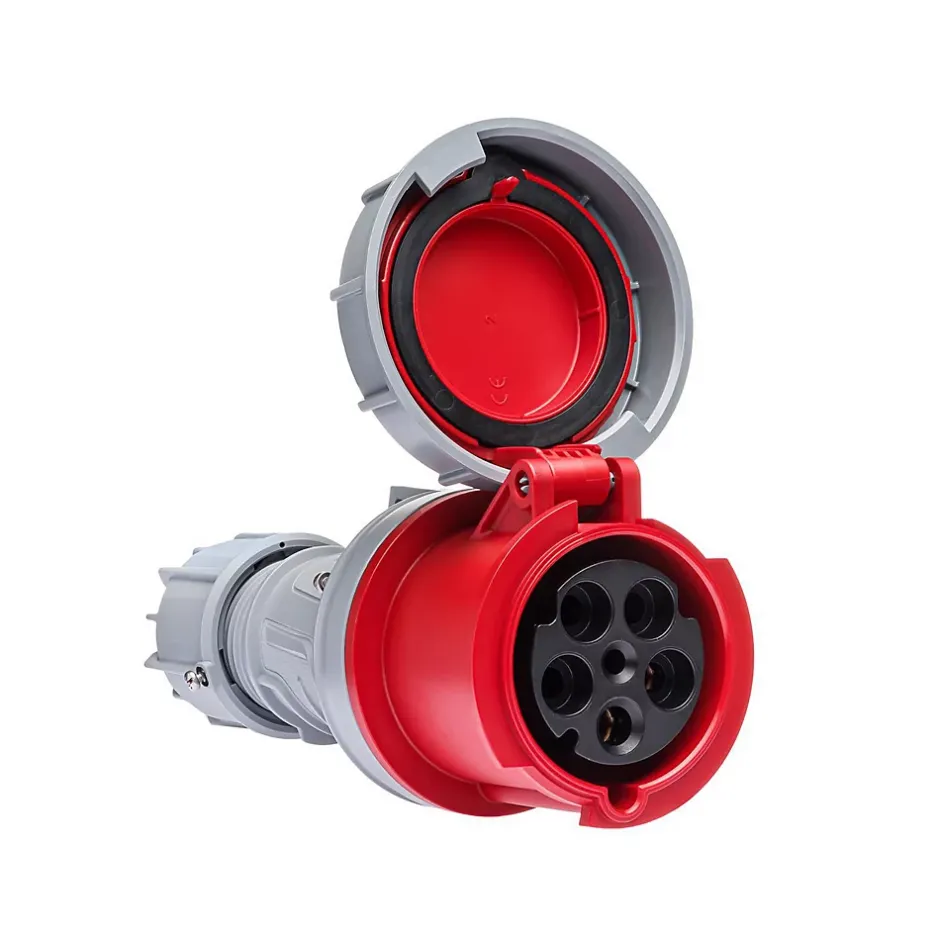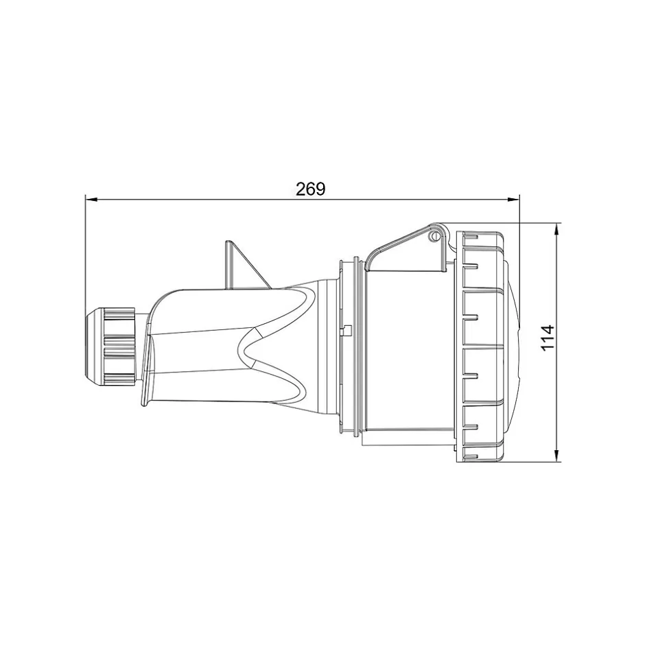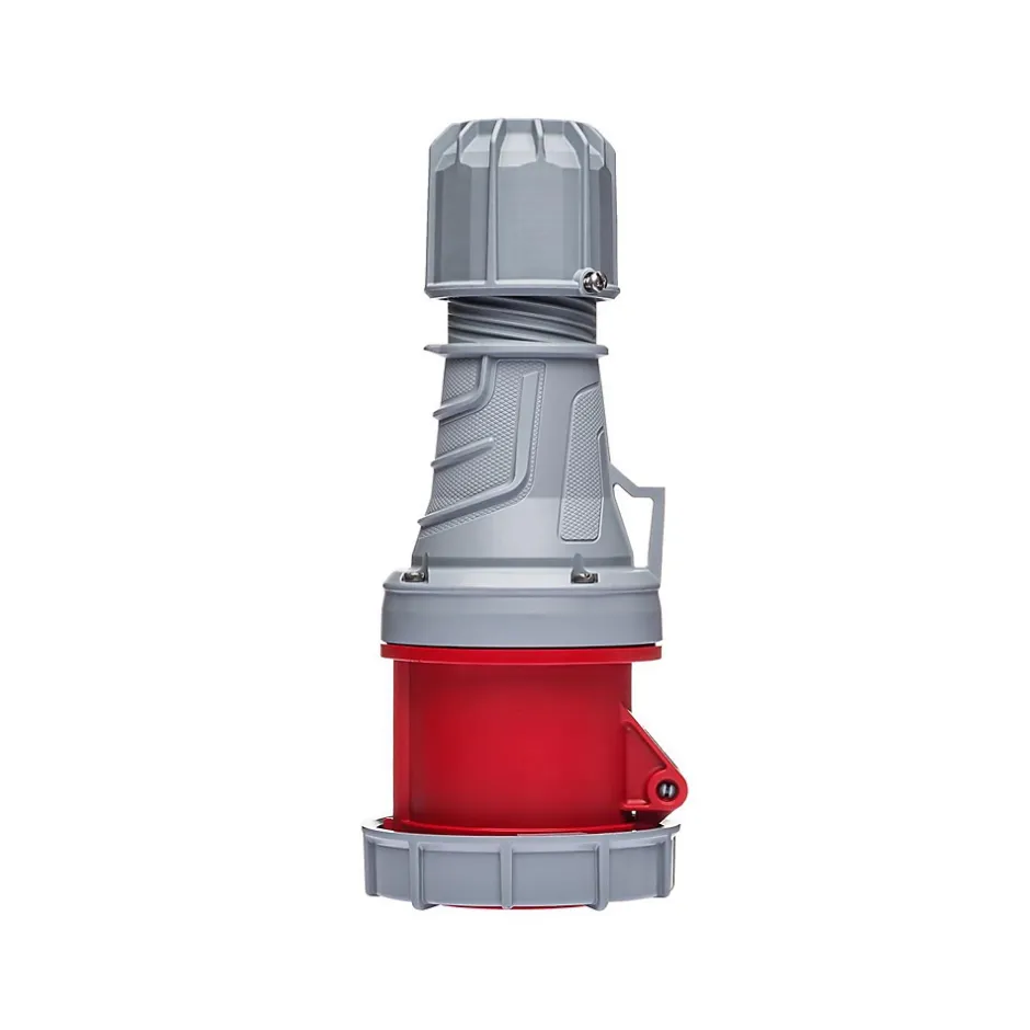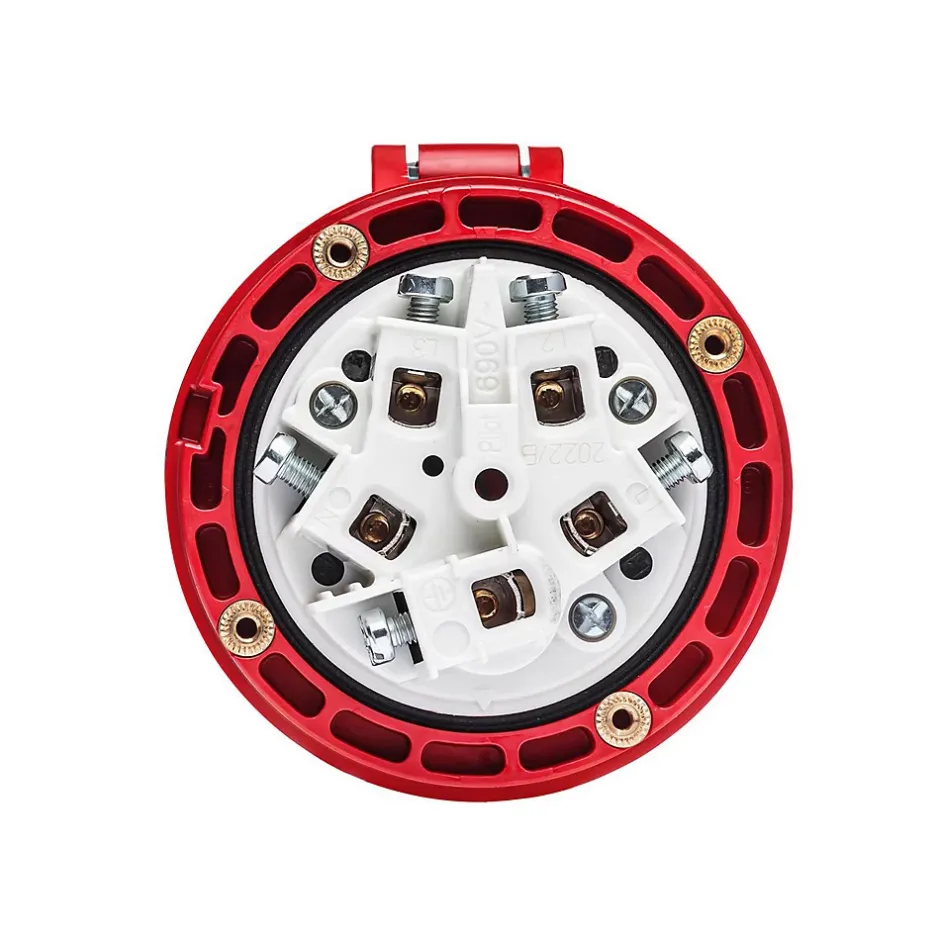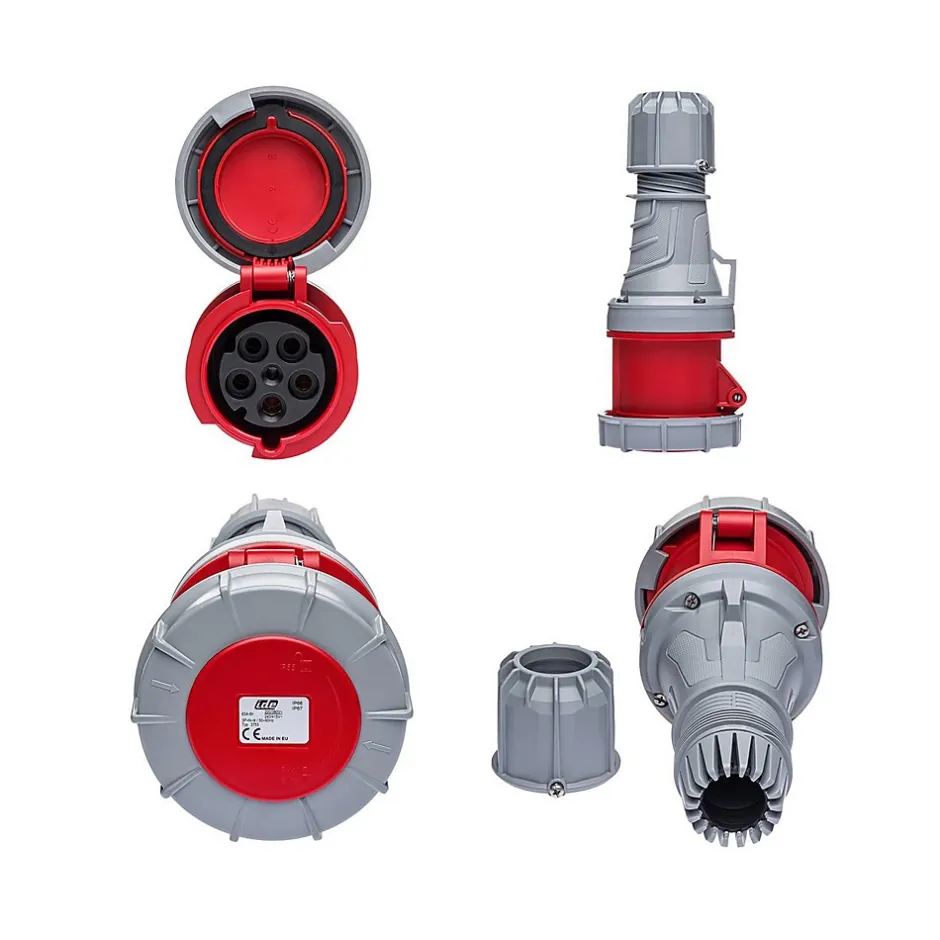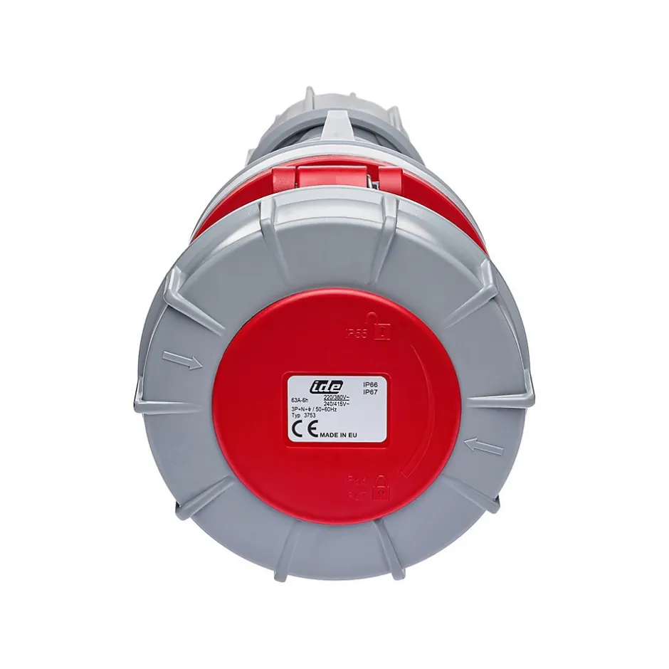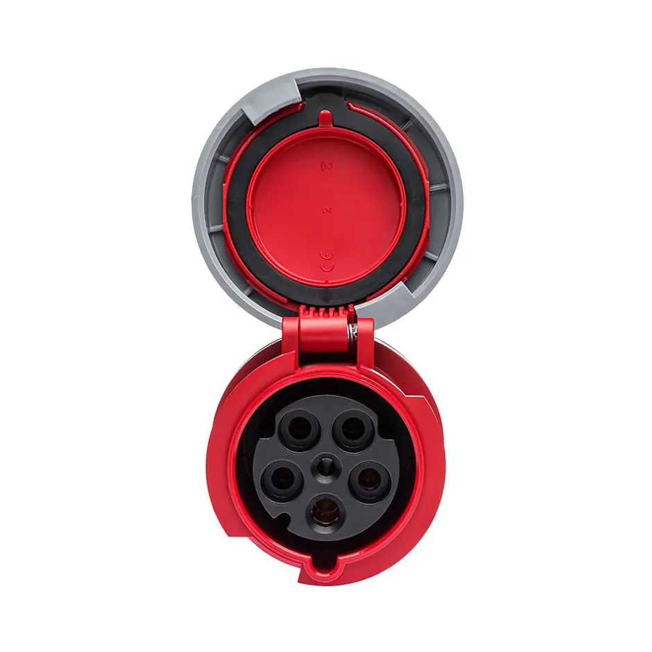 Prise femelle tripolaire 5x63A – sans fil piloteConçue pour les installations industrielles exigeantes, cette prise femelle possède un certificat d’étanchéité renforcée IP67. Cette fiche femelle 63A fonctionne en tétrapolaire (3P+N+T) sur une tension de 380V.Le raccordement de cette prise se fait par borne à vis avec une section de câble maximum de 25mm² en câble rigide et 16mm² en câble souple.Pour le câblage d’une rallonge, en 63A on utilise généralement du câble souple 16mm² avec embouts de câblage.Cette prise n’intègre pas de fil pilote. Elle reste compatible avec les prises mâles disposant d’un fil pilote mais la fonction contact pilote ne pourra pas être assurée.Cette fiche pour prolongateur peut être utilisée pour constituer une rallonge tétrapolaire, un adaptateur CEE ou un cordon d’alimentation.Sur devis nous pouvons vous câbler une rallonge ou un adaptateur sur mesure.L’essentiel sur la fiche femelle 380VRésistance aux chocs mécaniques : IK08Fabriqué en EspagneQualité professionnellePrise européenne CEE compatible toute marque (Legrand, Schneider…)Étanchéité renforcée IP67
