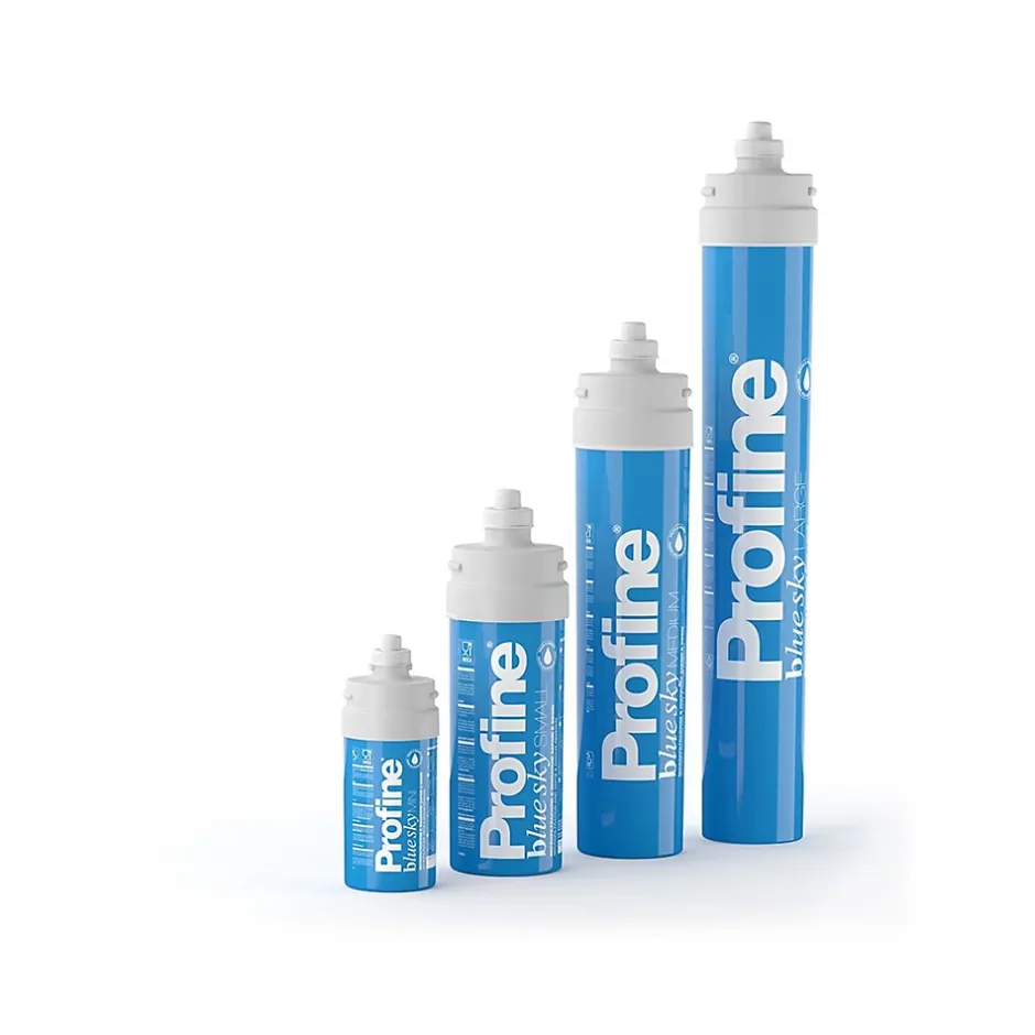 Filtre à eau potable Profine Blue Sky Small – Filtration sédiments et neutralisation des goûts et odeursLe filtre à eau potable Profine Blue Sky Mini élimine efficacement la turbidité, les goûts indésirables et le chlore dans l’eau potable. Avec sa filtration à 0,5 µm et son charbon actif extrudé, il garantit une eau plus claire et plus agréable à boire. Installation verticale ou horizontale possibles et verrouillage de la cartouche à baïonnettes. L’utilisation de ce filtre sera à usage domestiques, professionnels et industriels.Les avantages du filtre eau potable profine :Filtration à 0,5 µm : réduit sédiments, odeurs et goûtsRéduction du chlore et des macromolécules organiquesRéduit la turbidité de l’eauCartouche à connexion rapide, facile à installerAutonomie : jusqu’à 15 000 L d’eau traitée