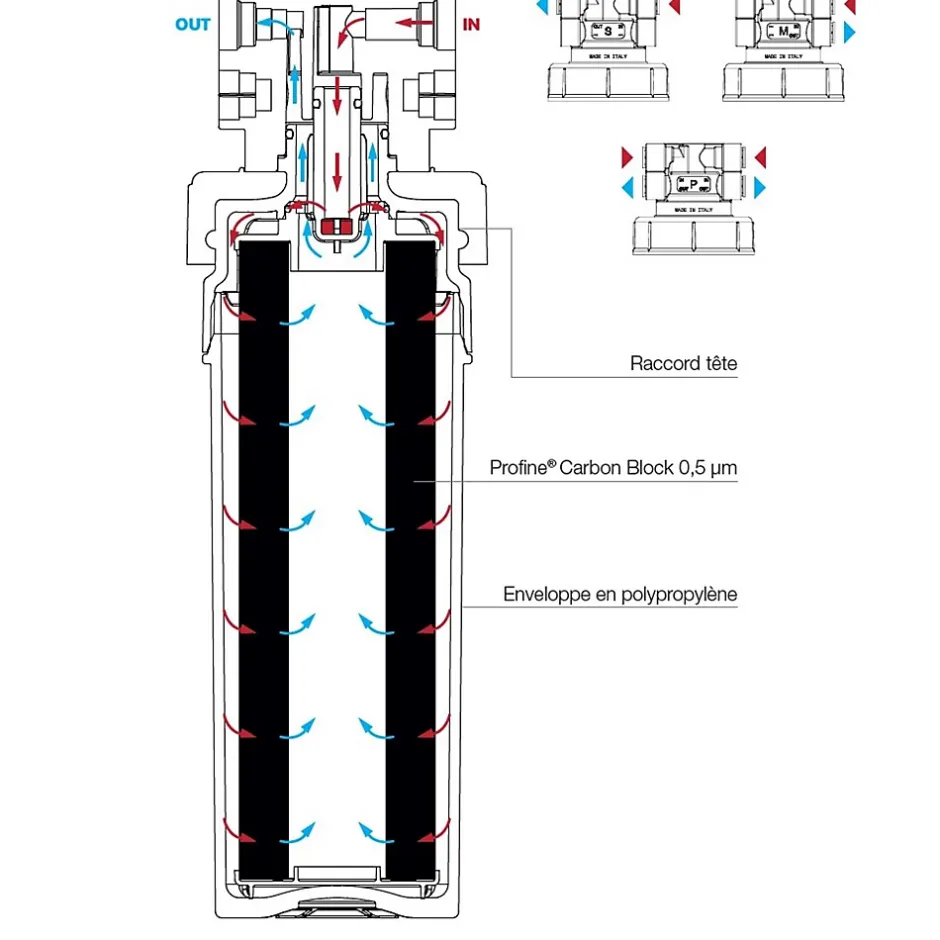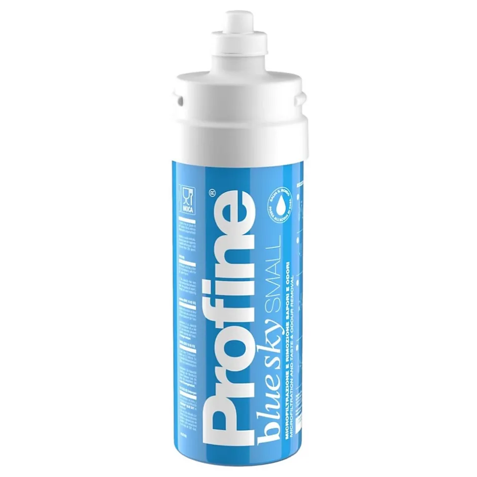 Filtre eau potable Profine Blue Sky Small – Filtration à charbon actif pour eau potableLe filtre a eau Profine Blue Sky Small est conçu pour améliorer la qualité de l’eau potable domestique ou professionnelle. Il élimine les sédiments >0,5 µm, le chlore, les goûts indésirables et la turbidité tout en réduisant les macromolécules organiques.Ce modèle utilise la technologie Profine Carbon Block extrudé, assurant une microfiltration fine avec un débit constant. Idéal en préfiltration pour osmose inverse, il s’installe aussi bien sur les réseaux d’eau potable existants que dans les applications café/restauration.Caractéristiques techniques du filtre eau profine :Débit max : 3 L/minHauteur : 270 mm (sans tête) / 302 mm (avec tête)Diamètre : 87,4 mmPression : 2 à 6 barsTempérature : 4 à 30 °CAutonomie : jusqu’à 15 000 litresInstallation et remplacement du filtre à eau :Montage vertical ou horizontal avec tête ProfineRemplacement recommandé tous les 12 moisConnexion baïonnette pour faciliter son remplacementNormes et certifications du filtre sous évier :Testé ICIM, conforme MOCA, ACSEntreprise certifiée ISO 9001 & ISO 14001Sans BPA – impact environnemental réduitFabriqué en Italie, le filtre eau potable Blue Sky Small est idéal pour clarifier l’eau du robinet, prolonger la durée de vie de vos équipements et garantir une eau saine au quotidien.Parfait pour les applications sensibles : cuisine, fontaines, distributeurs d’eau, plomberie domestique, machines à café ou restauration.