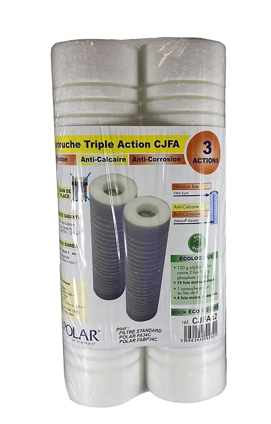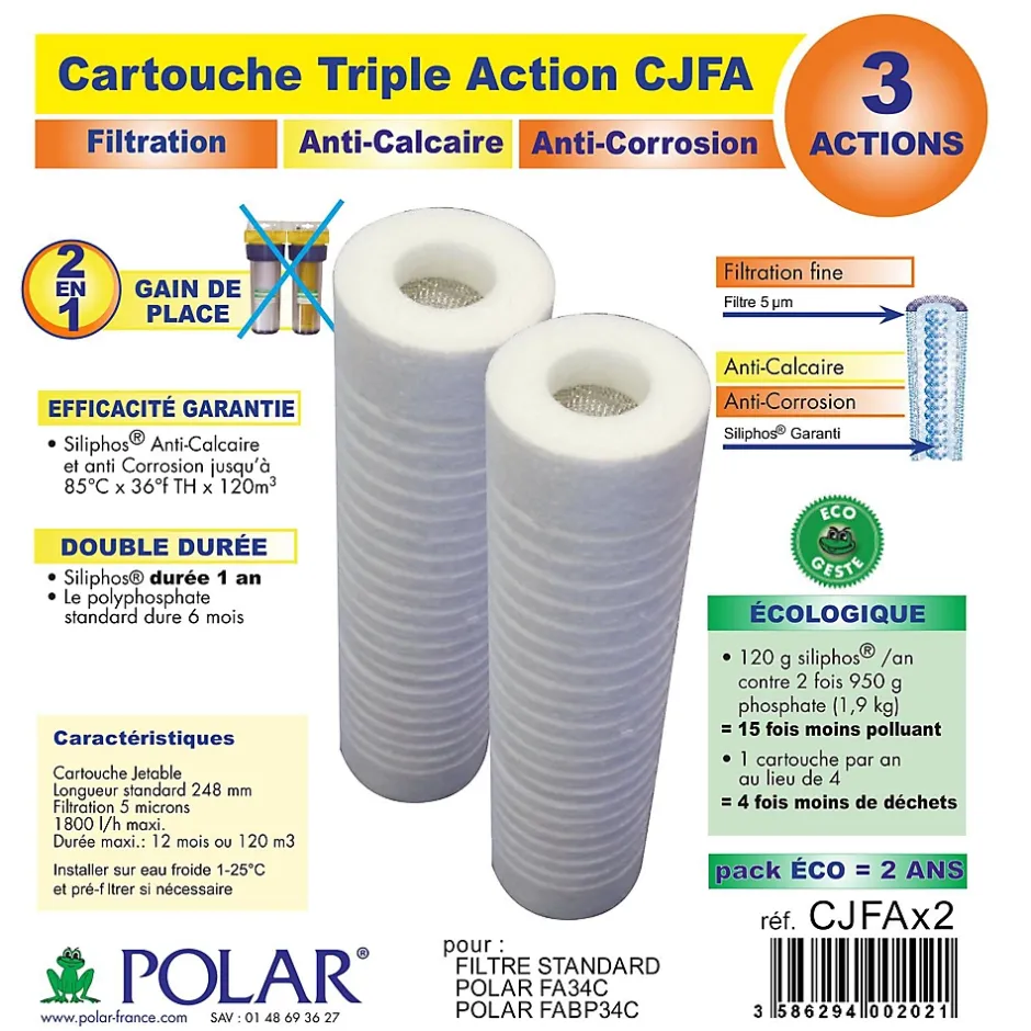 Cartouche triple action : Filtration / Anti-calcaire / Anti-corrosionCartouche jetableLongueur standard : 248 mmFiltration 5 microns1 800 l/h maxiDurée maxi : 12 mois ou 120 m3