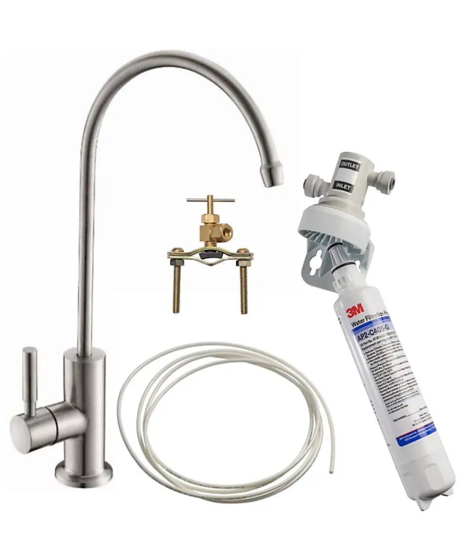 Kit complet de filtration sous évier pour filtrer l’eau de boisson et vous assurer une eau filtrée de qualité supérieure grâce à l’efficacité de la cartouche 3M.Ce système de filtration sous évier est vendu complet pour faciliter son installation, il n’a jamais été aussi simple d’avoir son eau purifiée.Grâce à la cartouche 3M, profitez d’une eau meilleure sans vous soucier des impuretés qui peuvent s’y trouver. La cartouche 3M débarrasse l’eau des microplastiques et impuretés qui peuvent s’y trouver mais réduit également les pesticides, herbicides et chlore, tout en éliminant le mauvais goût et odeur de l’eau. Le kit complet de filtration sous évier comprend un robinet pour eau de boisson au design sobre et élégant. Technologie 3M : Pour une eau de qualitéFiltration des microplastiques et impuretés présents dans votre eauReduction efficace des pesticides, herbicides et chloreElimination du mauvais goût et odeur de l’eauCette cartouche est certifiée ACS et NSF pour le chlore et cysts.Grâce à son efficacité, profitez d’une eau purifiée en toute circonstance.Comment utiliser cette cartouche filtrante ?Cette cartouche peut-être utilisée dans divers systèmes d’eau potable, par exemple dans un réfrigérateur ou dans une fontaine à eau.La cartouche 3M AP2-C405-G élimine chlore, mauvais goût et odeur de l’eau tout en réduisant les composants organiques volatiles (benzène, toxaphène et dichlorobenzène)Seuil de filtration : 5 micronsCartouche à remplacer régulièrement pour une filtration optimale.Remplacement à réaliser tous les 4000 L ou tous les 6 mois environ.Le colis contient :Robinet d’appoint x1Cartouche filtrante 3M AP2-C405-G x1Tête de filtre 3M VB2-JG x1Robinet auto perceur x1Tube x1