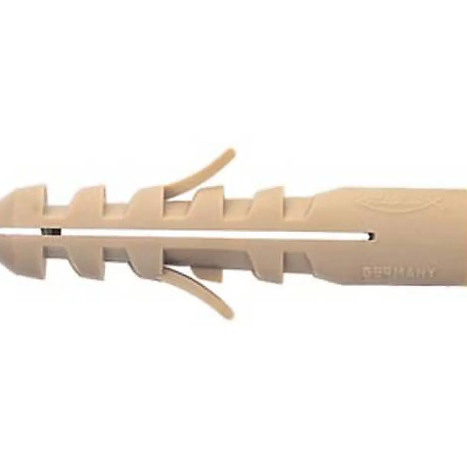 Cheville à expansion plastique Fischer M8 S, diamètre 10 mm, longueur 50 mm, lot de 50 pièces. Conçue pour fixer vis métriques et goujons filetés dans béton, pierre naturelle, briques pleines et creuses, blocs légers, plaques de plâtre et autres matériaux indiqués. Matériaux : corps en Nylon et insert en laiton. Caractéristiques : montage simple grâce à la géométrie d’expansion, ailettes d’écartement parallèles réduisant le décalage près des bords, compatibilité avec vis Ø8 mm. Garantie fabricant : 2 ans.