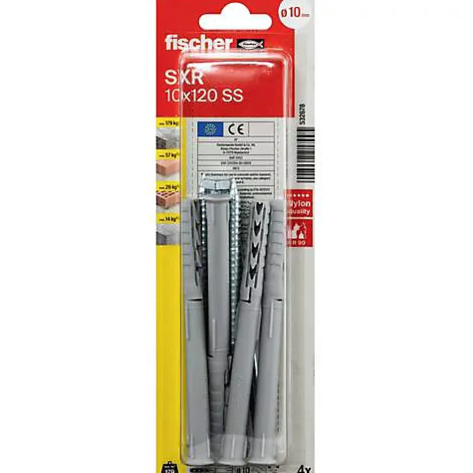 Cheville à tige longue Fischer SXR-SS 10 x 120, lot de 4 avec 4 vis à tête hexagonale 7,0 x 127 mm. Cheville nylon haute qualité, expansion dans matériaux pleins et ancrage en cavité dans matériaux ajourés. Profondeur d’ancrage réduite (50 mm) pour des fixations économiques, idéale pour systèmes non porteurs et fixations multiples. Convient pour béton, brique perforée, brique silico-calcaire creuse ou pleine, pierre naturelle, blocs isolants et mur en béton cellulaire. Vis en acier étamé par galvanisation, diamètre extérieur 10 mm, perceuse recommandée 10 mm. Évaluation ETA pour béton et maçonnerie, résistance à la corrosion, garantie fabricant 2 ans.