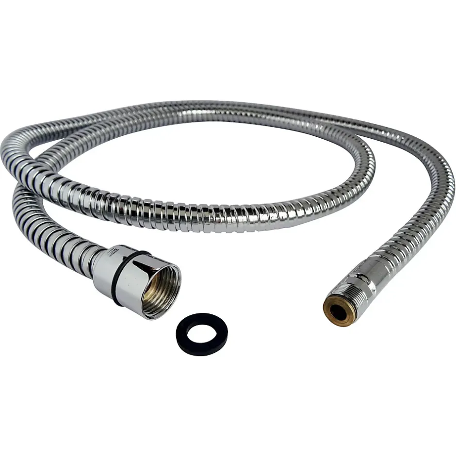. Flexible de douchette pour mitigeur d’évier en EPDM, simple agrafage en métal chromé, de longueur 1,50 m. . Le raccordement se réalise à l’aide d’un écrou tournant conique 15/21, et Mâle 15/100. . L’étanchéité est assurée par 2 joints plats fournis.